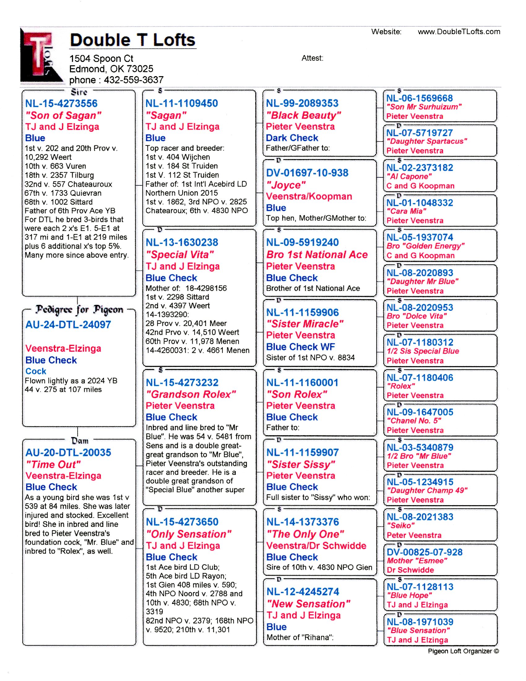 Dam: AU-20-DTL-20035 “Time Out” - TJ & J Elzinga (via Pieter Veenstra), inbred to Veenstra’s foundation cock, “Mr. Blue”. She flew briefly as a YB for DTL. She was 1st v. 539 at 84 miles. She was injured and placed in the stock loft...and bred winners with "Son of Sagan".
