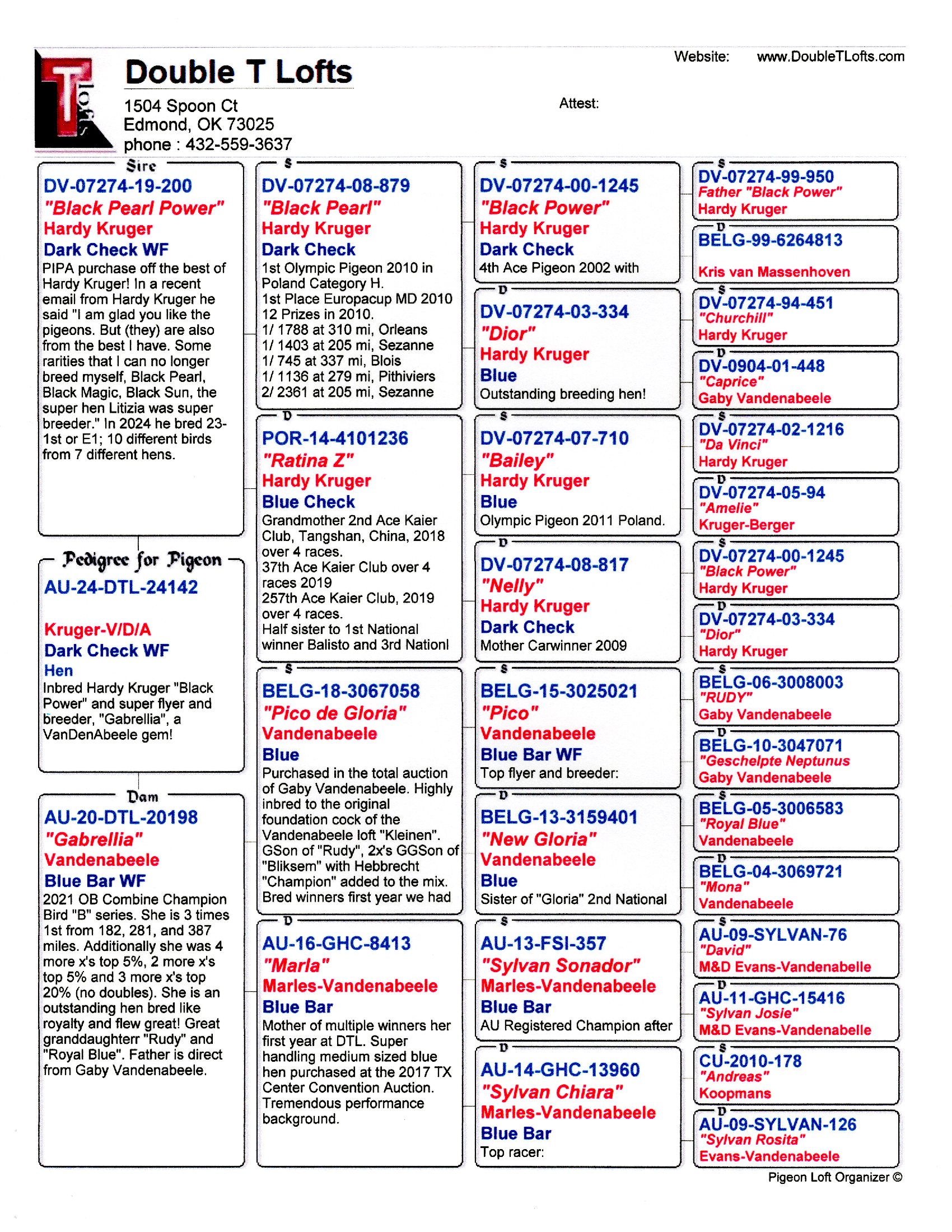 Sire: DV 07274-19-200 “Black Pearl Power” – Outstanding Hardy Kruger bred son of “Black Pearl”, the 1st Olympic Pigeon 2010, and grandson of “Black Power” & “Dior”. He is inbred to “Black Power” and line bred to “Black Pearl”. A pedigree full of winners. Hardy Kruger has outstanding OLR results and his birds are in great demand the world over! For us (DTL) in 2024 YBs “Black Pearl Power” bred children that had 23-1st or E1. There were 10 different E1 birds and they were bred from 7 different hens. Pretty amazing!