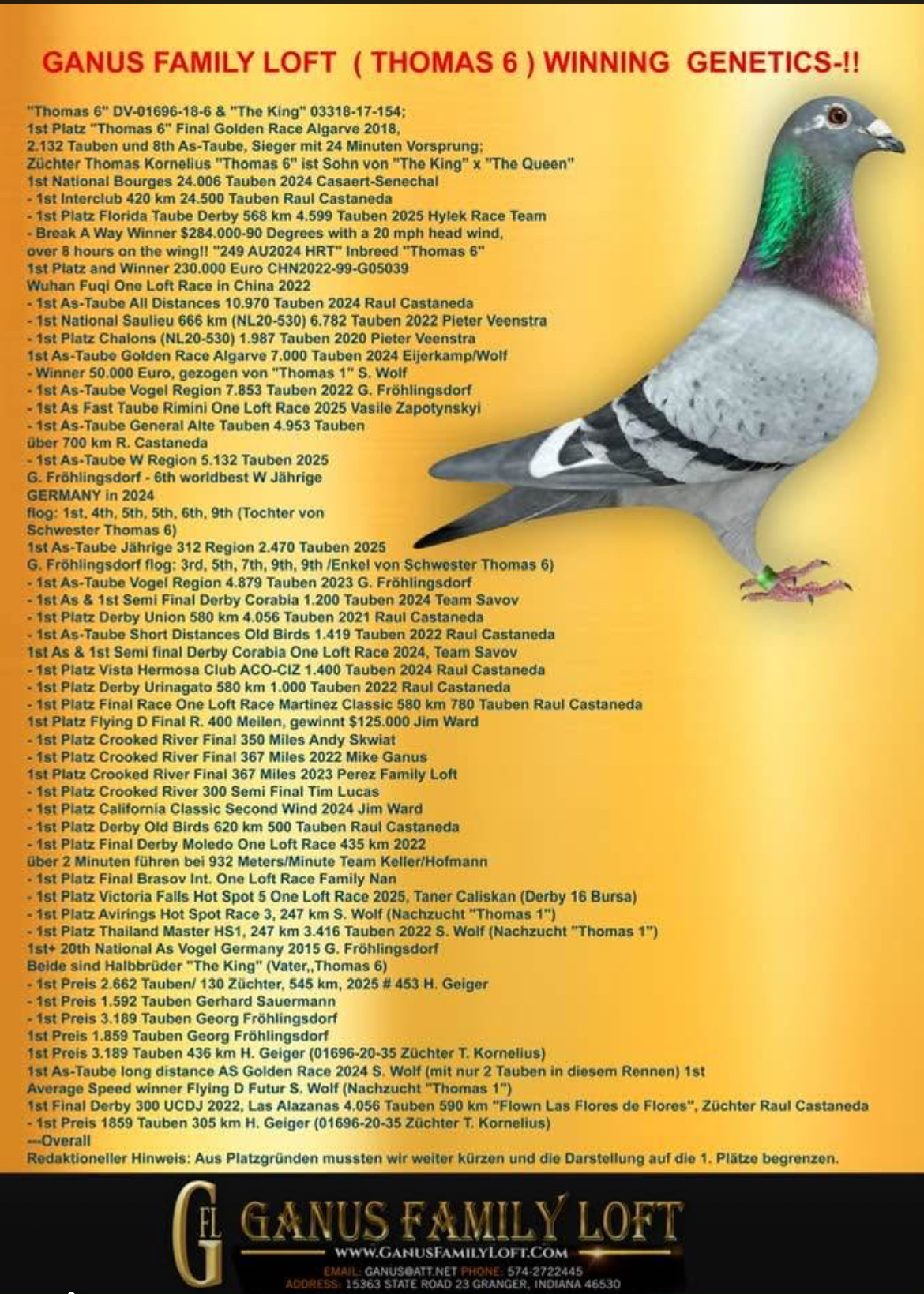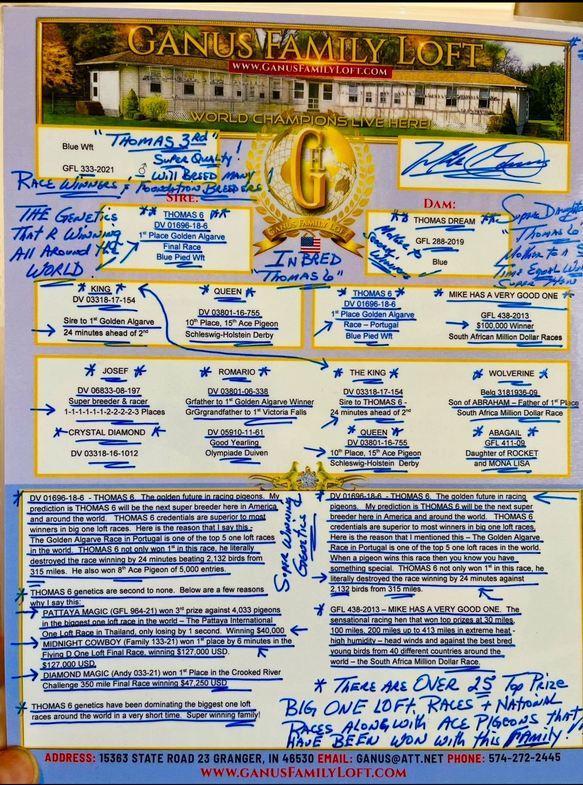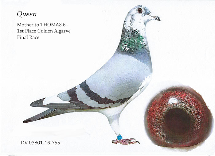 "THOMAS 6" 1 ST PLACE GOLDEN ALGARVE FINAL RACE WINNER, vs 2,132 birds 315 miles .ALSO 8 TH ACE PIGEON OF 5,000 BIRDS ENTERED & BREAK AWAY WINNER by 24 mins ahead vs 50 COUNTRIES.