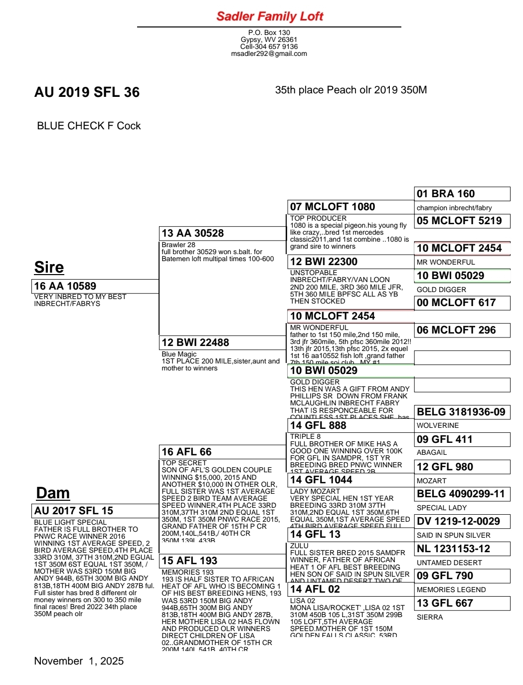 Due to moving and building a small loft I'm unable to keep birds sitting on the side. This cock has the best of the old club birds several top birds in Baltimore from the Fabry birds, the mother side is my best breeding hen from the wolverine family