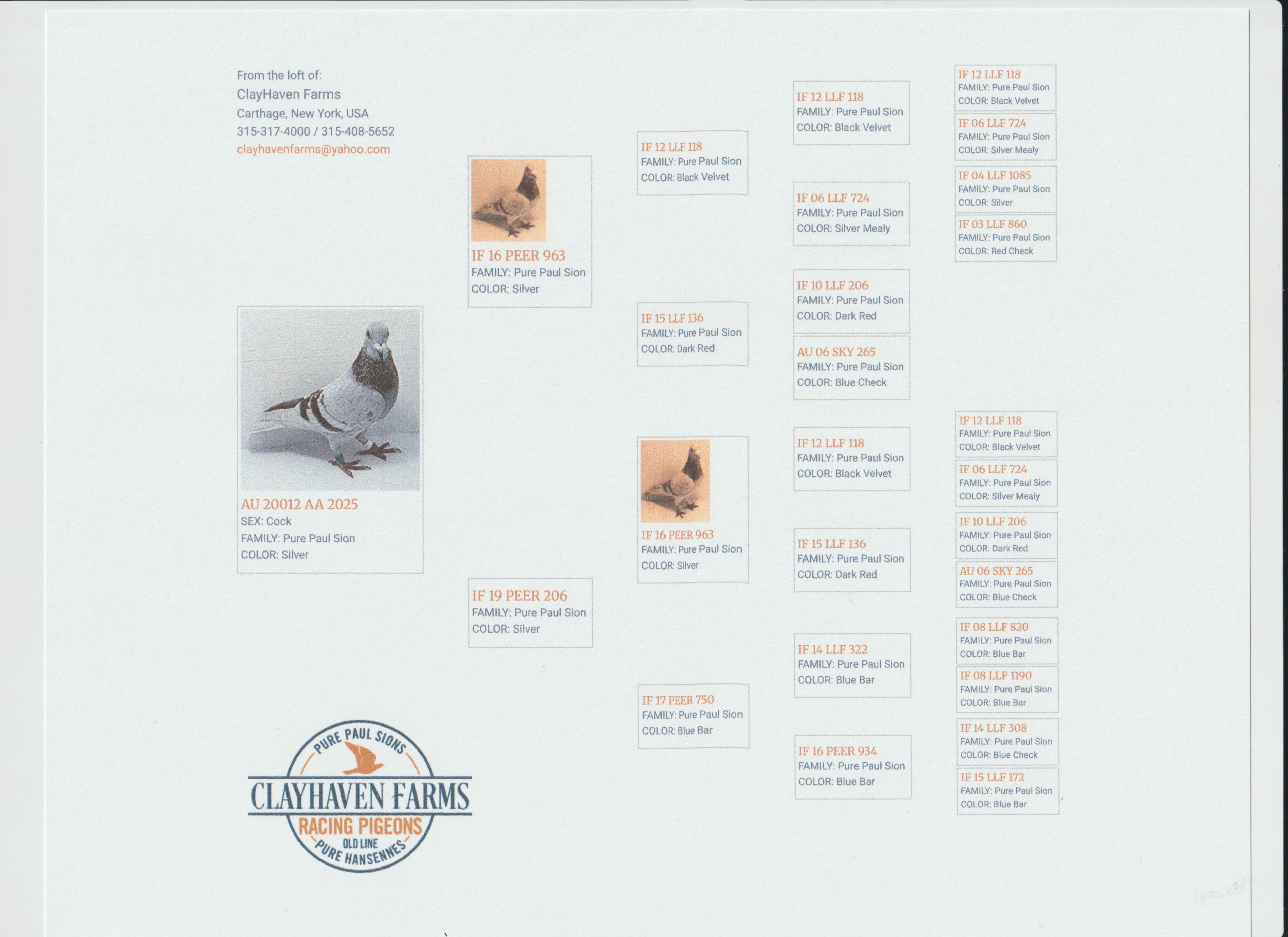 Birds which are from a family of “old line” PAUL SIONS. They have been maintained and kept straight for about 60 years by Harvey Peer of New Jersey through a judicious program of line-breeding and inbreeding and strict selection. This family is primarily based on the old and very successful Landing View Loft “Black Eyed Sions” and with the addition of some select birds a number of years ago from the Charles Heitzman and Madrona Loft [Paul] Sion lines. It is interesting to note that a large number of the present day Sions in this family still have the dark mahogany / chestnut / wine colored eyes which were so characteristic of the old Landing View Sions. These Sions are generally medium in size with some being a little below medium and some slightly over medium and, in spite of the many years of linebreeding and inbreeding, they have maintained their strength and vigor. Overall, they are characterized by good backs, very strong vents, and wonderful eyes. They are also great looking birds, typical of the old Sion strain. Since this is a closely line-bred and inbred family, they should make an ideal cross with most other strains.