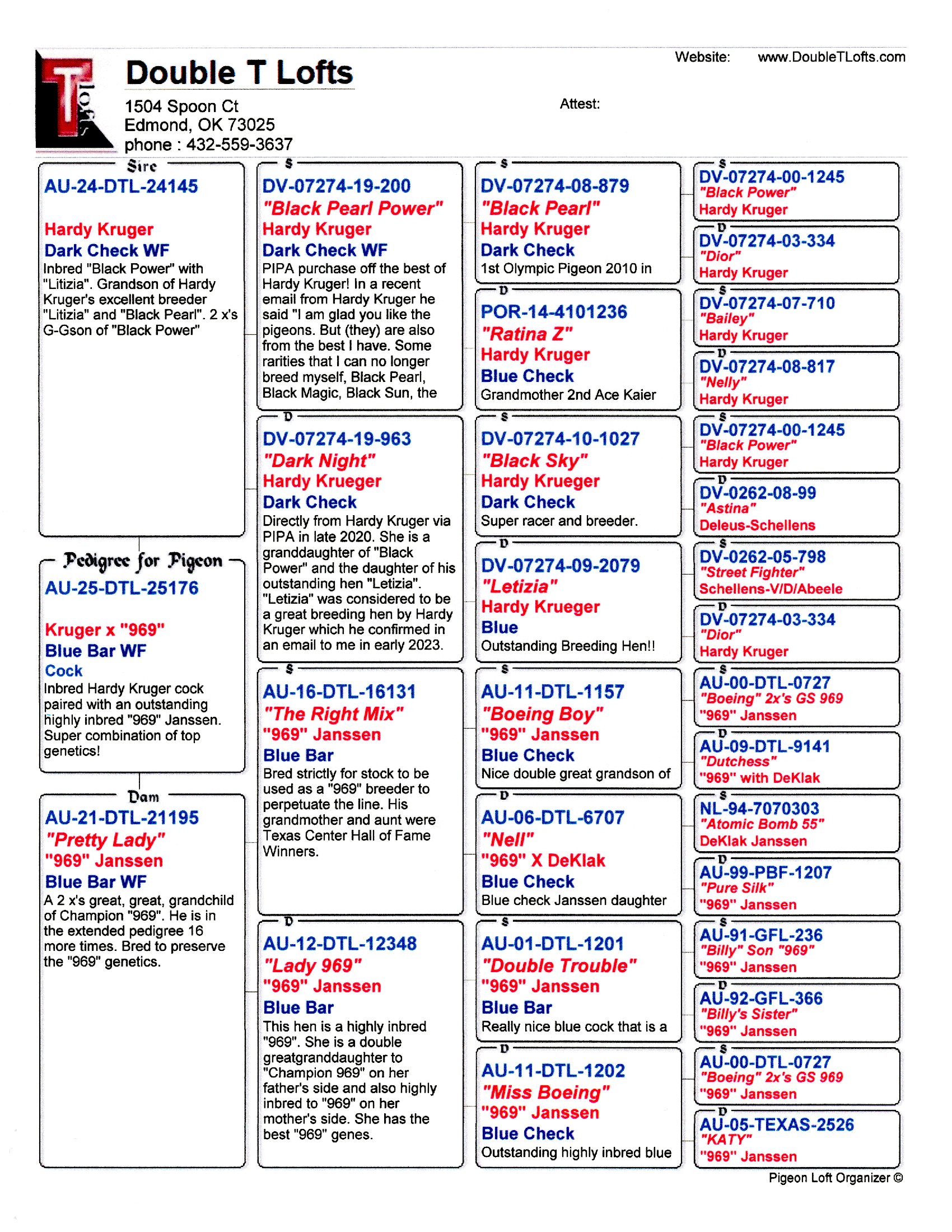 Sire: AU-24-DTL-24145 DCWF - Son of 2-direct Hardy Kruger birds, both grandchildren of "Black Power". His half siblings (from his sire) for DTL in 2024 YBs had 23-1st or E1. There were 10 different E1 birds and they were bred from 7 different hens. Pretty amazing!