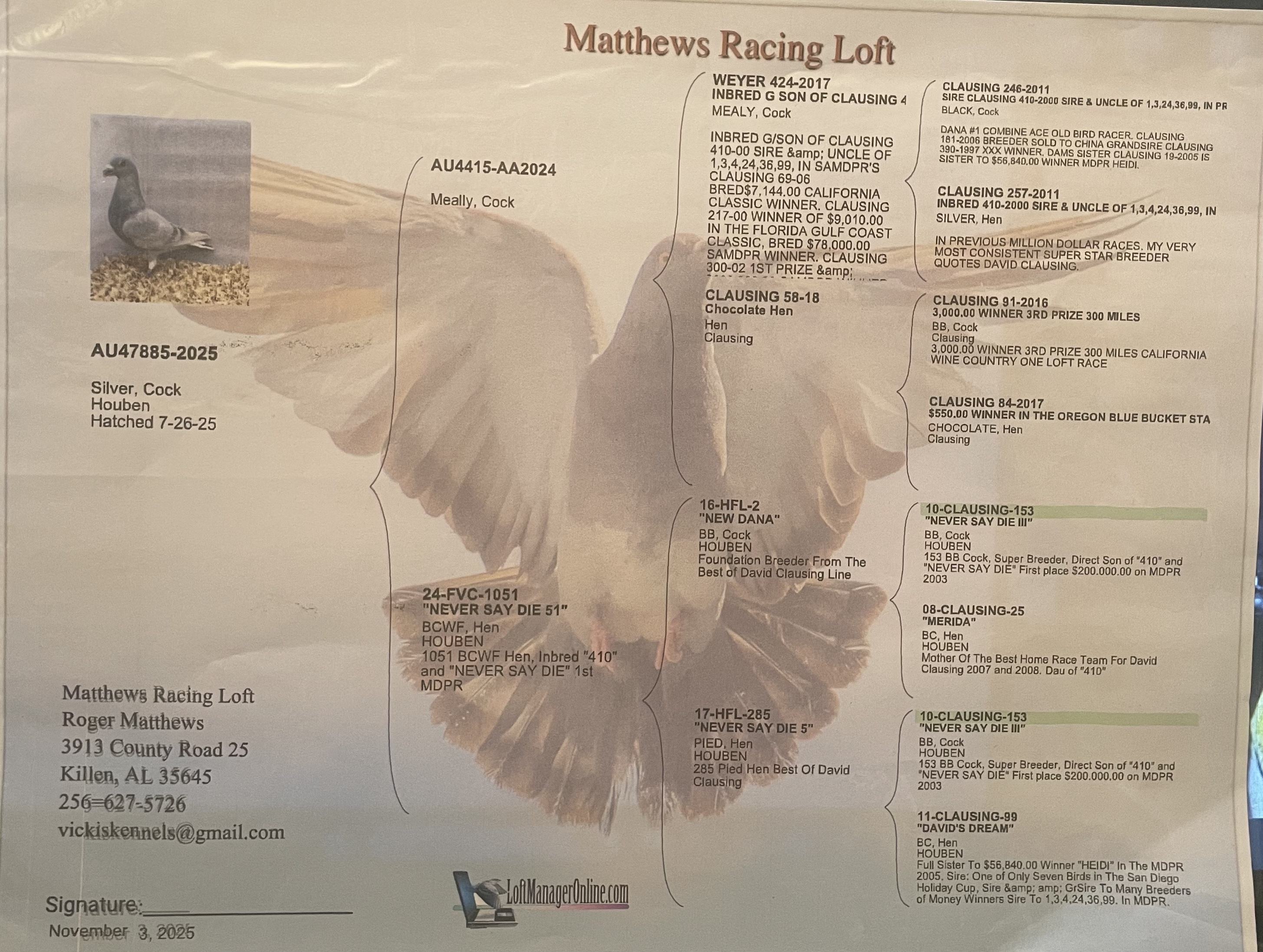 Hatched July 26th 2025. Sex is not guaranteed. Inbred from David Clausings old line of Houbens, 410, Dana, Never Say Die. He has never been flown. Check pedigree.