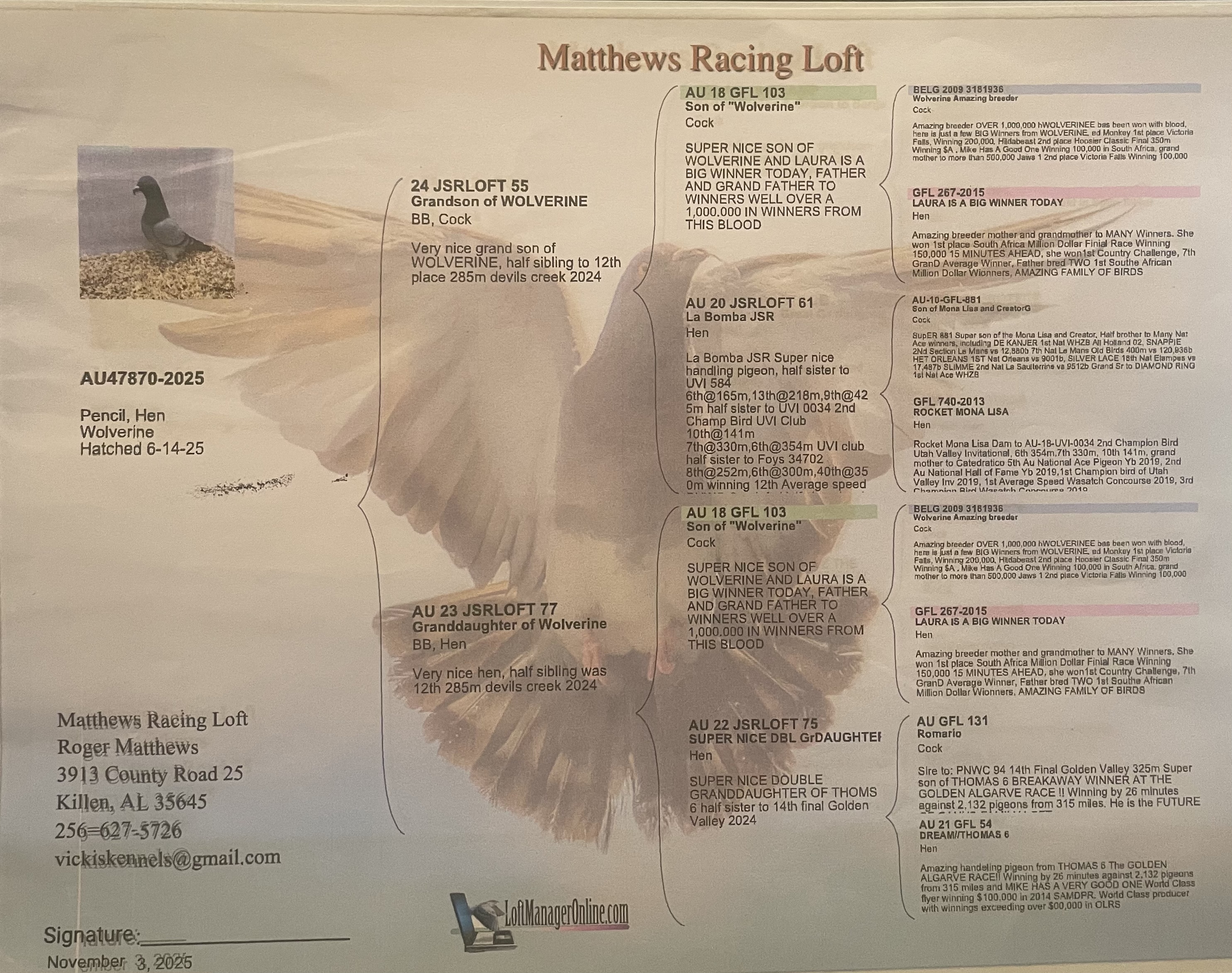 Double bred Wolverine and Laura is a big winner today. She has never flown. Sex not guaranteed. Check Pedigree. Hatch date June 14Th 2025.