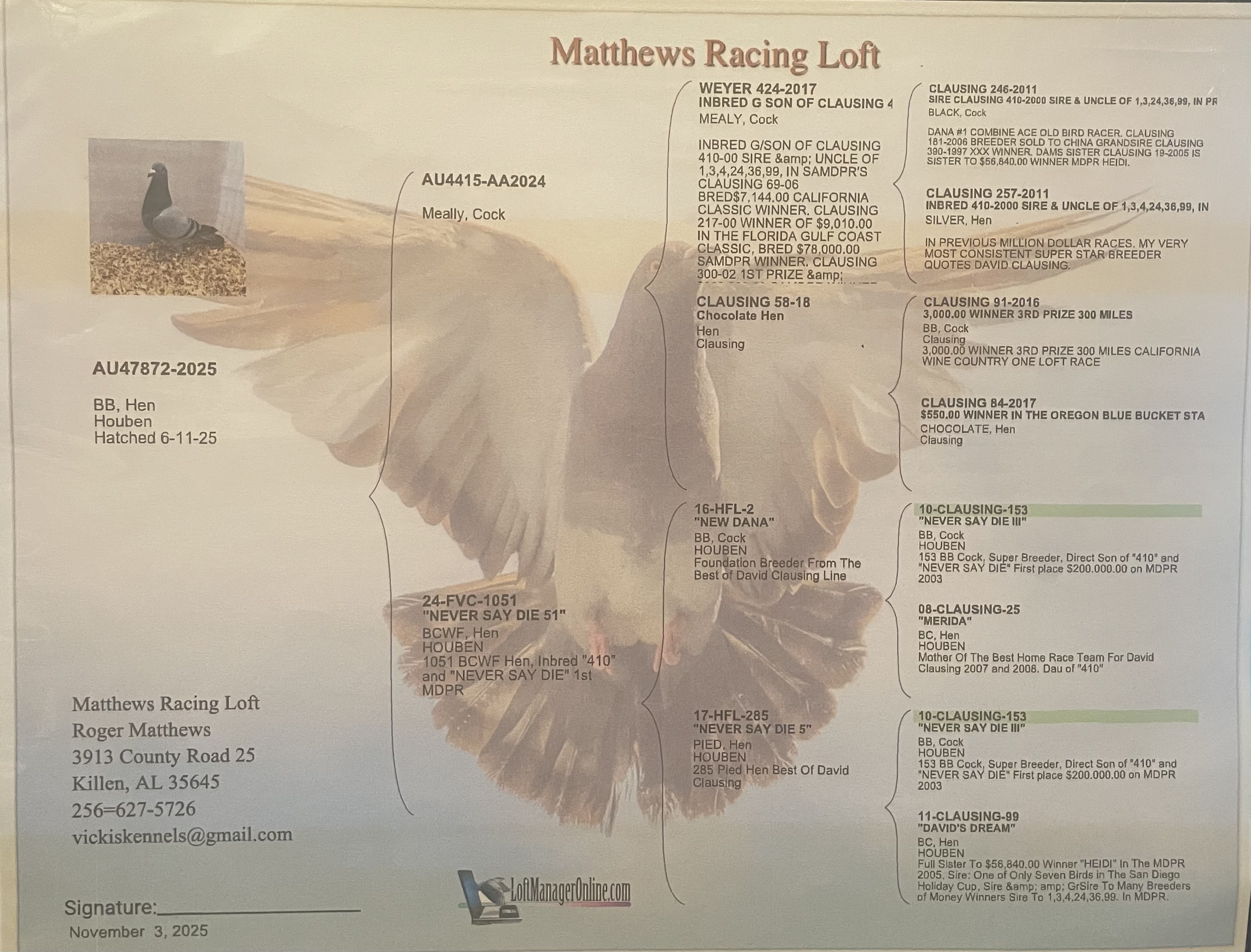 Hatch date June 11th 2025. Inbred from David Clausing's old line of Houbens 410, Dana, Never Say Die. Check Pedigree. She has never been flown. Sex is not guaranteed.