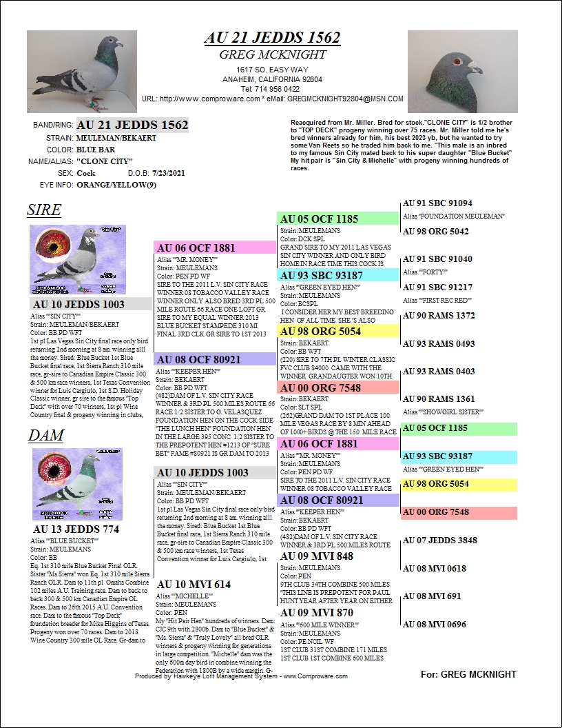"CLONE CITY" DIRECT FROM "SIN CITY" MY #1 COCK MATED TO HIS BEST DAUGHTER "BLUE BUCKET" HUNDREDS OF WINNERS WITH THIS COMBINATION IN MANY LOFTS AROUND THE WORLD. I REAQUIRED THIS MALE ABOUT 2 YEARS AGO & HAVEN'T BRED FROM HIM, ALREADY PROVEN FROM PREVIOUS OWNER, WANTED TO TRADE HIM FOR A VAN REET, SO I WAS EXCITED TO GET HIM BACK. "I'M ONLY SELLING HIM, AS I HAVE 2 BROTHERS THAT HAVE ALSO BRED TOP PRIZE WINNERS & NEEDING TO REDUCE MY NUMBERS IN THE BREEDING LOFT AS I ONLY HAVE SO MUCH ROOM" CLONE CITY IS JUST UNDER MEDIUM SIZE WITH NICE QUALITY FEATHER, STRONG VENTS, QUALITY BALANCE, NICE LOOKING, PINK THROAT & ALREADY BRED WINNERS FOR PAST OWNER. "MY GUESS IS HE'LL BE A FOUNDING BIRD IN YOUR LOFT, HIS SIRE 'SIN CITY' WAS THE ONLY BIRD CLOCKED ON 2ND MORNING AT 8 AM WITH NO OTHER BIRDS RETURNING FROM THE LAS VEGAS SIN CITY FINAL RACE GOING ON TO BE MY #1 BREEDING COCK, HE'S MY COCK OF THE 'HIT PAIR' WITH "MICHELLE" WHO'S DAM WAS THE ONLY DAY BIRD AT THE 600 MILE IN THE COMBINE ALSO WINNING THE FEDERATION WITH 1800 BIRDS, THE DAM OF 'CLONE CITY' IS 'BLUE BUCKET' ANOTHER GREAT HEN & DAM TO "TOP DECK" WITH OVER HUNDRED WINNERS WITH PROGENY" YOU HAVE A FATHER & DAUGHTER PAIRING FROM MY BEST, COULDN'T SELL YOU BETTER. "JUST HAVE TO REDUCE DOWN" STARTED THIS ONE AT A REASONABLE PRICE TO GIVE ALL A CHANCE TO GET AS GOOD AS I HAVE" ANY QUESTIONS PLEASE CALL/TEXT AT 714 469 2557 OR EMAIL ME AT GREGMCKNIGHT92804@MSN.COM "BID WITH CONFIDENCE" GREAT OPPORTUNITY FOR THE NEWBIE & VETERAN ALIKE. THANK YOU IN ADVANCE FOR PURCHASING. GOOD LUCK. SINCERELY, GREG MCKNIGHT.