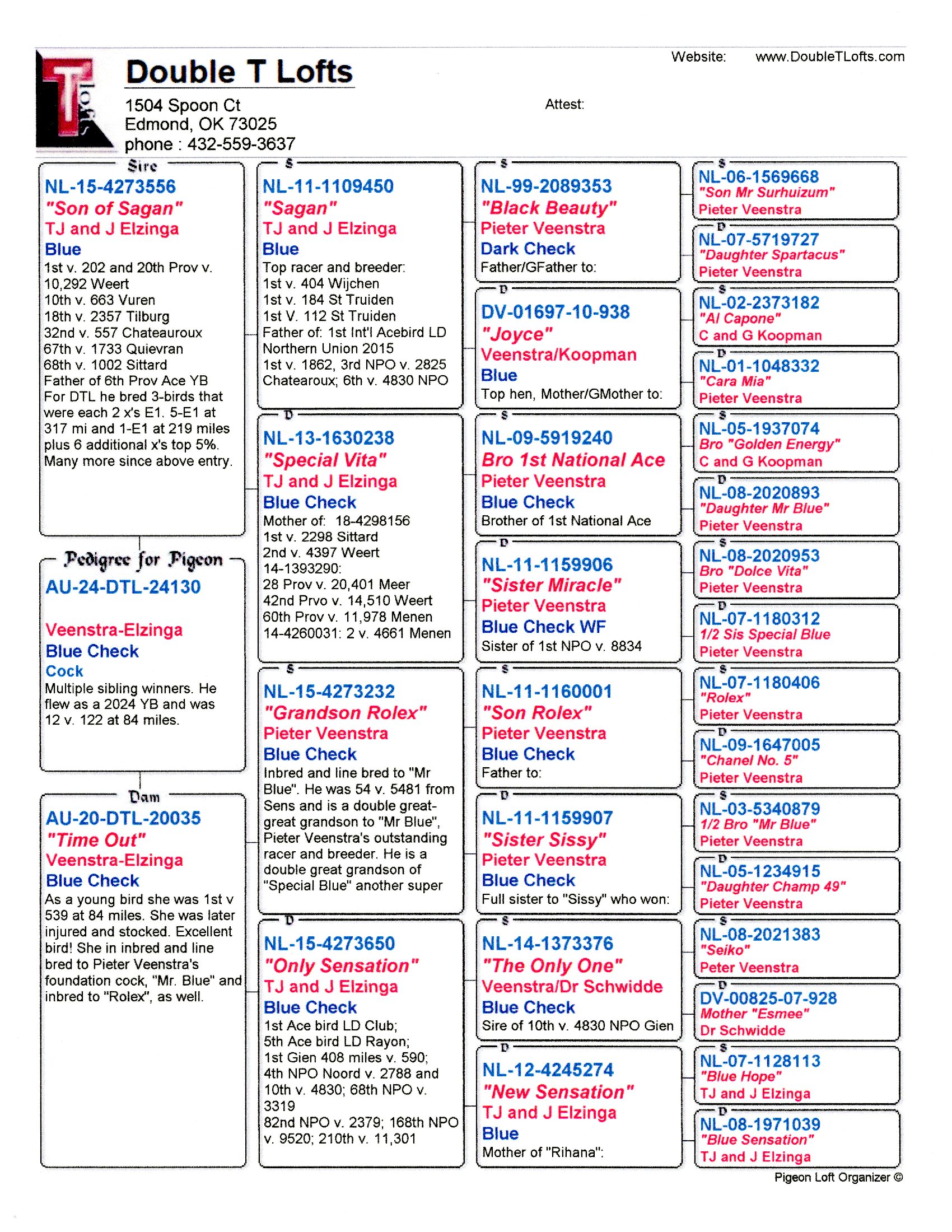 Dam: AU-20-DTL-20035 “Time Out” - TJ & J Elzinga (via Pieter Veenstra), inbred to Veenstra’s foundation cock, “Mr. Blue”. She flew briefly as a YB for DTL. She was 1st v. 539 at 84 miles. She was injured and placed in the stock loft.