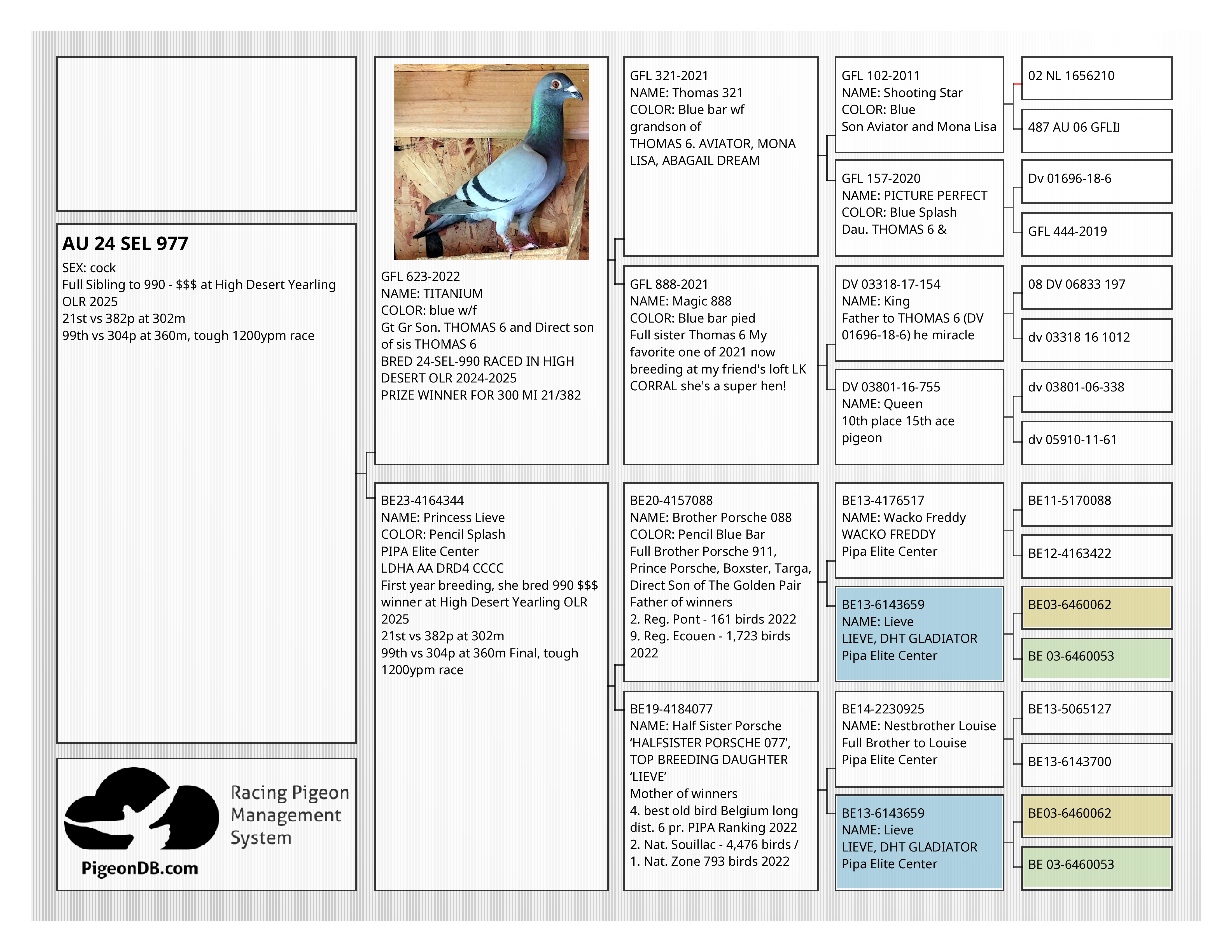 Sire is a son to sister of Thomas 6. Super OLR bloodlines around the world.