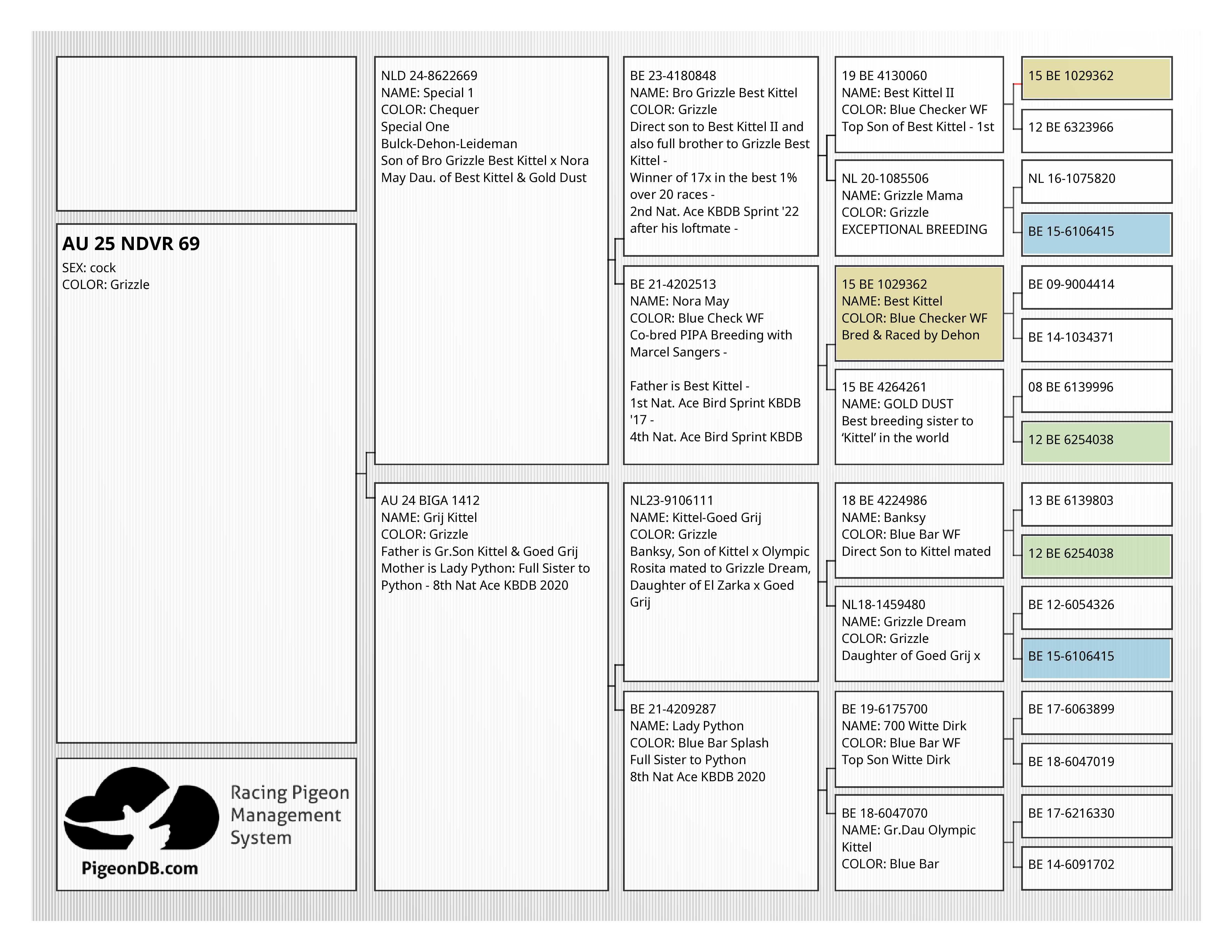 Dam is niece to super racer "Python," 8th Nat. Ace KBDB 2020 & Gr.dau to Super Breeder "Banksy" mated to "Grizzle Dream," daughter of Goed Grijs.