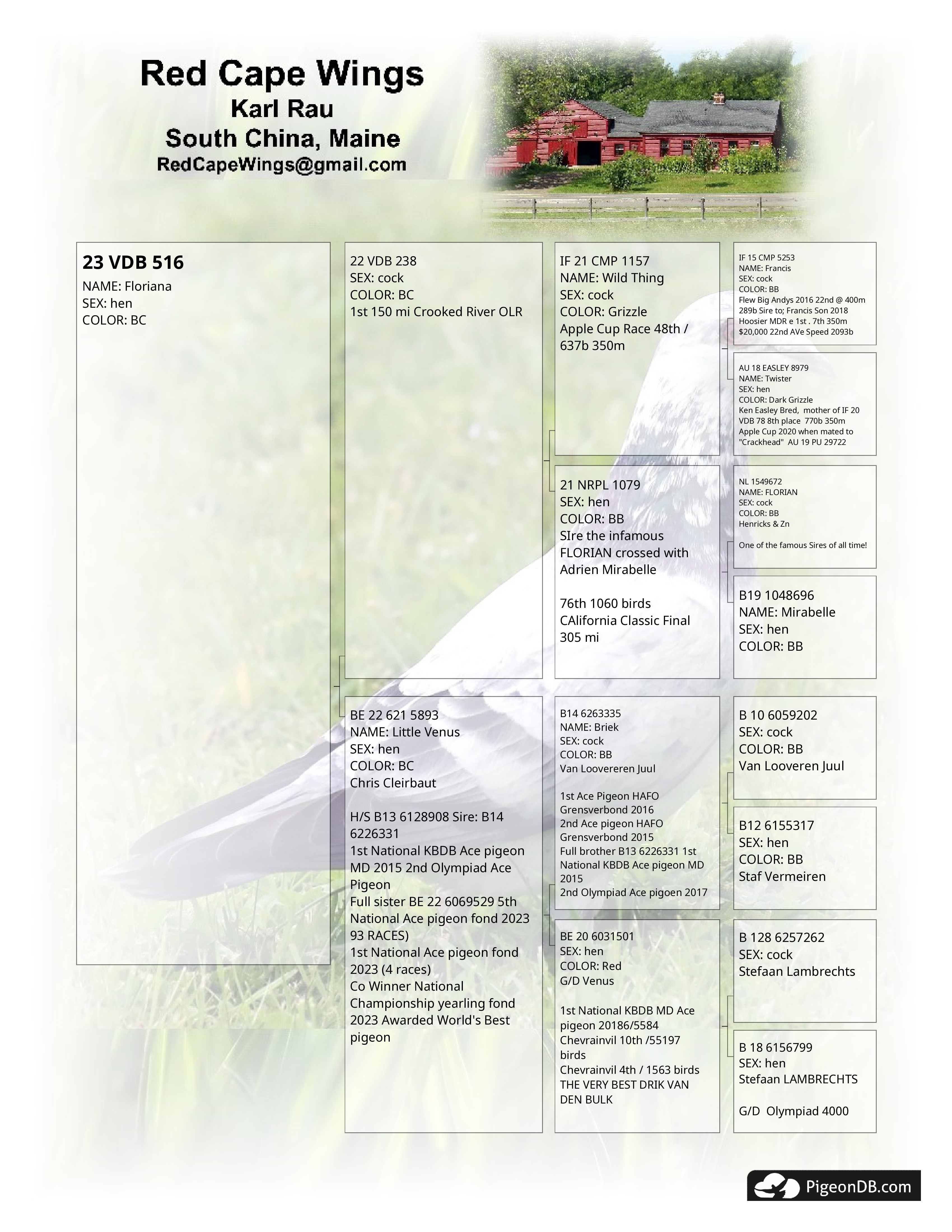 Chris Cleirbaut H/S B13 6128908 Sire: B14 6226331 1st National KBDB Ace pigeon MD 2015 2nd Olympiad Ace Pigeon Full sister BE 22 6069529 5th National Ace pigeon fond 2023 93 RACES) 1st National Ace pigeon fond 2023 (4 races) Co Winner National Championship yearling fond 2023 Awarded World's Best pigeon