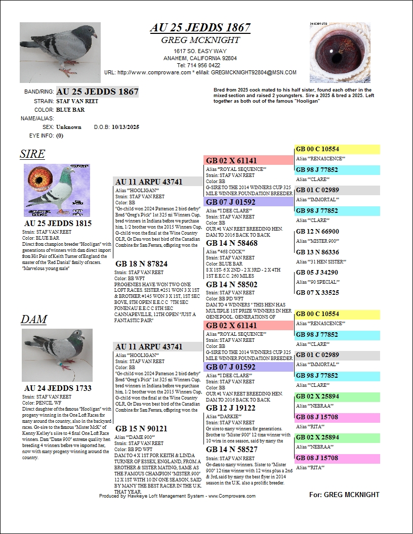 "35 DAY OLD NEST MATE YOUNGSTERS, READY TO SETTLE OR STOCK" BRED FROM DIRECT CHILDREN OF "HOOLIGAN" SO THESE BIRDS ARE CARRYING 50% OF HIS BLOOD, LIKE GETTING A DIRECT OFFSPING. THE SIRE FROM THIS YEAR LOCATED HIS ½ SISTER IN THE MIXED SECTION PAIRING UP & I DECIDED TO LET THEM RAISE A ROUND, HERE THEY ARE. NICE IN HAND LIKE THE GR-SIRE, MEDIUM IN SIZE SOFT SUPPLE MUSCLE, NICE LOOKING HEALTHY YOUNGSTERS. "A GREAT DEAL FOR THE NEW PURCHASER PICKING UP CLOSE BRED, READY TO SETTLE FOR FLYING OR FUTURE BREEDING FROM GR-SIRE TO ONE OF MY BEST BREEDERS IN LOFT WITH PROGENY WINNING IN CLUB RACES IN INDIANA, ONE LOFT RACES AT THE FINALS IN HOLIDAY CLASSIC, BLUE VELVET, TEXAS LONGHORN, CANADA RACES WITH BIRD OF THE YEAR AWARDS, GR-SIRE TO THE FAMOUS "MISTER MCK" OF KENNY KELLEY'S PLUS MANY MORE. DAM TO THESE TWO WAS RETAINED FOR STOCK & A BEAUTY WITH THESE TWO THE FIRST FROM HER. "SELLING THESE TWO AT A FAIR STARTING PRICE" I'M SURE THE NEW PURCHASER WILL BE HAPPY WITH THEM BOTH. "THE SIRE IS A 2025 HATCH, AN EXAMPLE OF THE FAST MATURING OF THESE 'RED DANIAL' VAN REETS. NOTE: PEDIGREES FOR BOTH WILL BE ATTACHED IN SHIPPING BOX. ANY QUESTIONS PLEASE CONTACT ME AT 714 469 2557. THANK YOU IN ADVANCE FOR PURCHASING. "BID WITH CONFINDENCE" BEST OF LUCK. SINCERELY, GREG MCKNIGHT.
