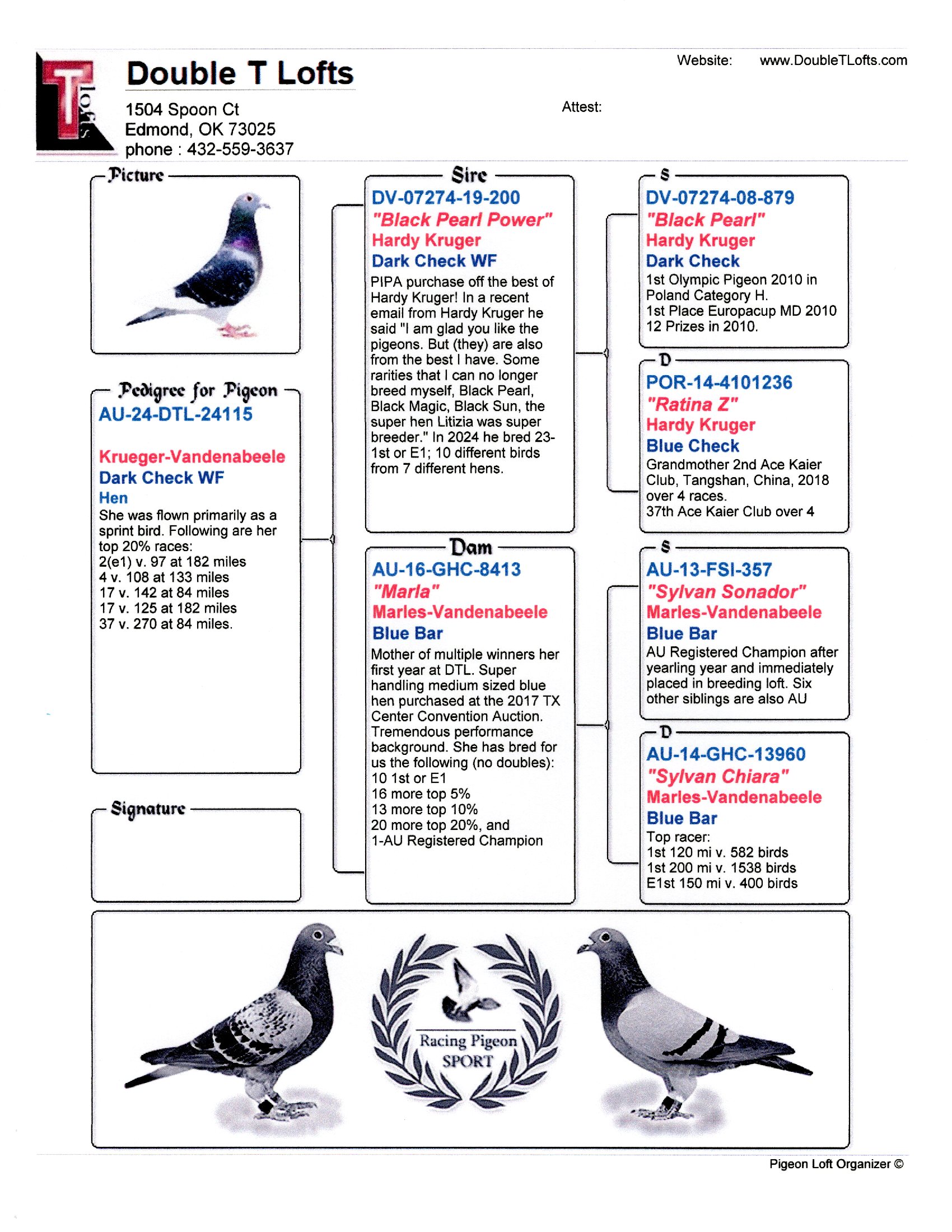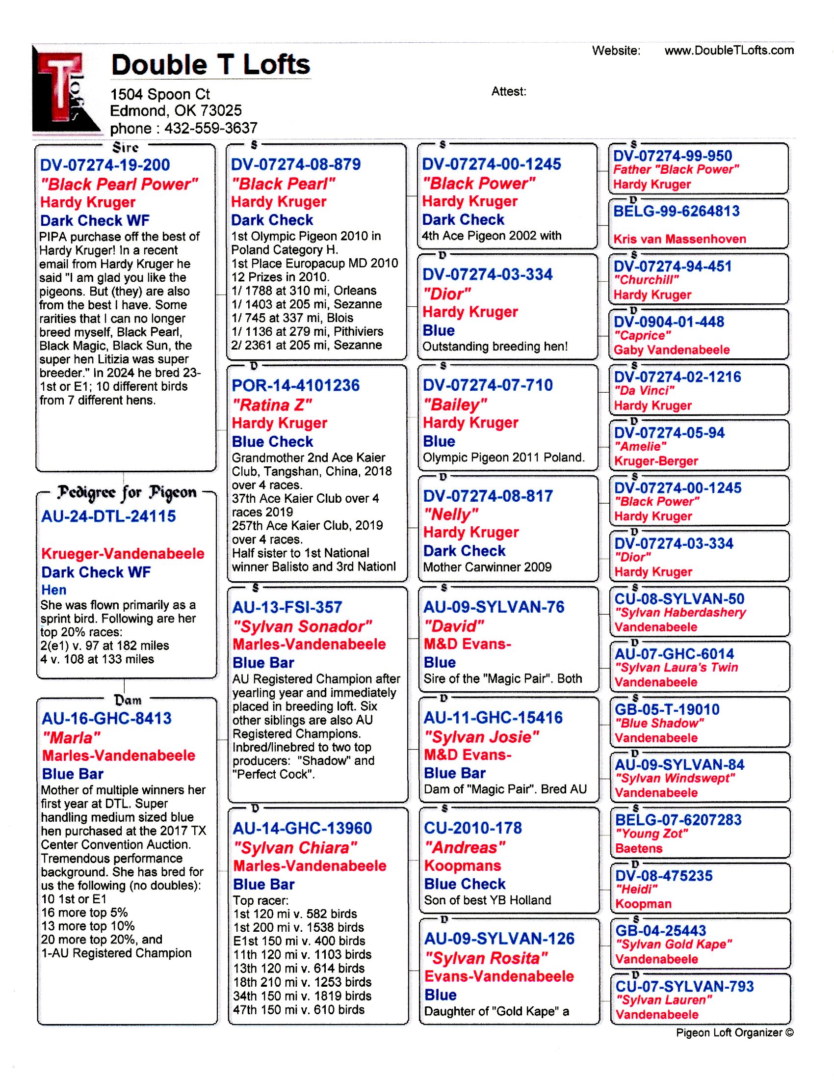 Sire: DV 07274-19-200 “Black Pearl Power” – Outstanding Hardy Kruger bred son of “Black Pearl”, the 1st Olympic Pigeon 2010, and grandson of “Black Power” & “Dior”. He is inbred to “Black Power” and line bred to “Black Pearl”. A pedigree full of winners. Hardy Kruger has outstanding OLR results and his birds are in great demand the world over! For us (DTL) in 2024 YBs “Black Pearl Power” bred children that had 23-1st or E1. There were 10 different E1 birds and they were bred from 7 different hens. Pretty amazing!