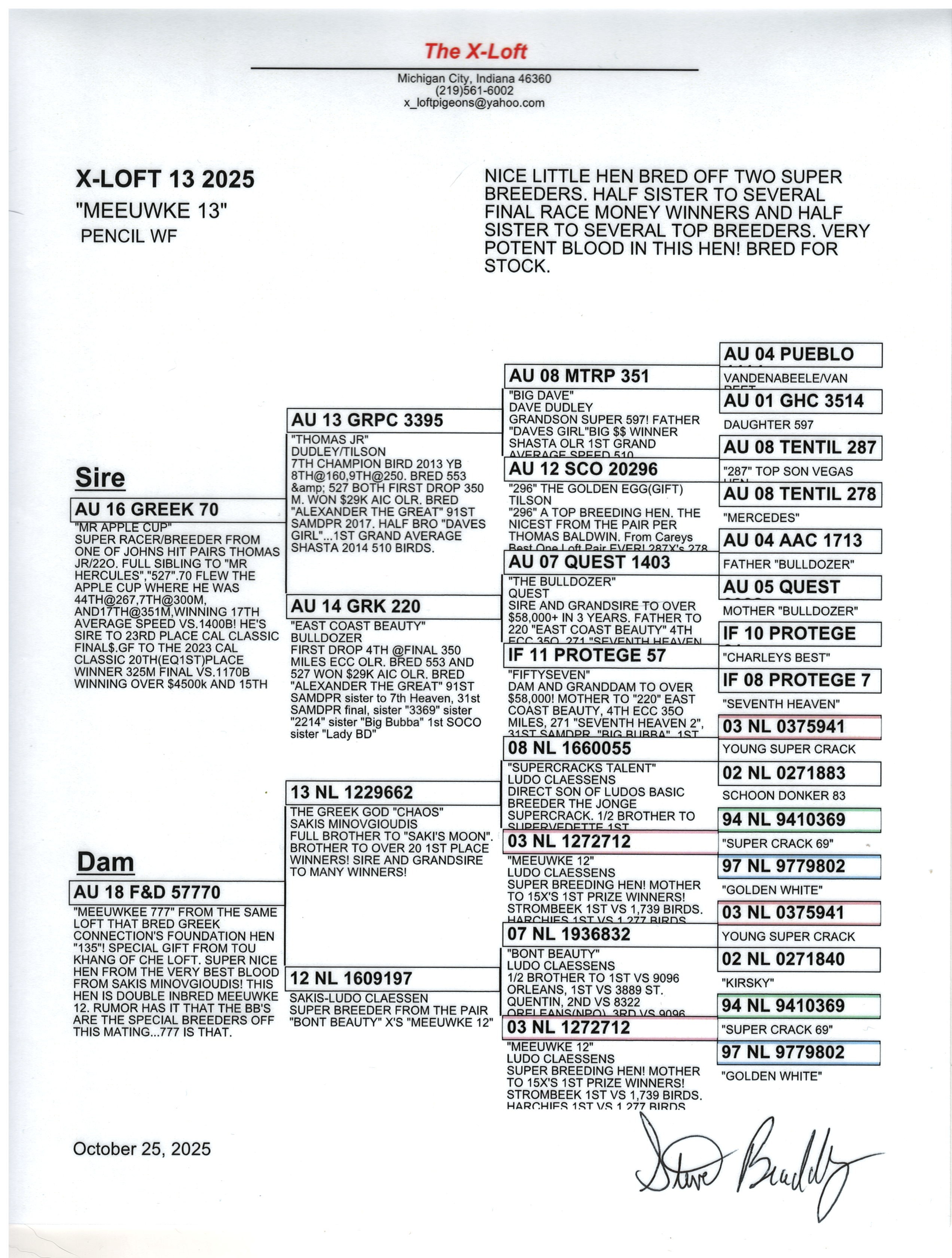 X-Loft 13, 2025, "Meeuwkee 13", Beautiful hen off 2 top producers. Half sibling to several top money winners.