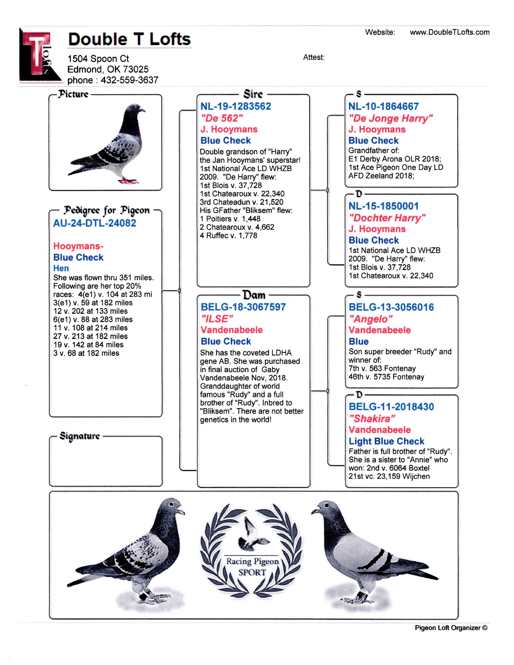 AU-24-DTL-24082 BC - This is a super nice hen that is larger than medium. She has a very good back, tight vents and 1-pin tail. She flew well and following are her top 20% races: