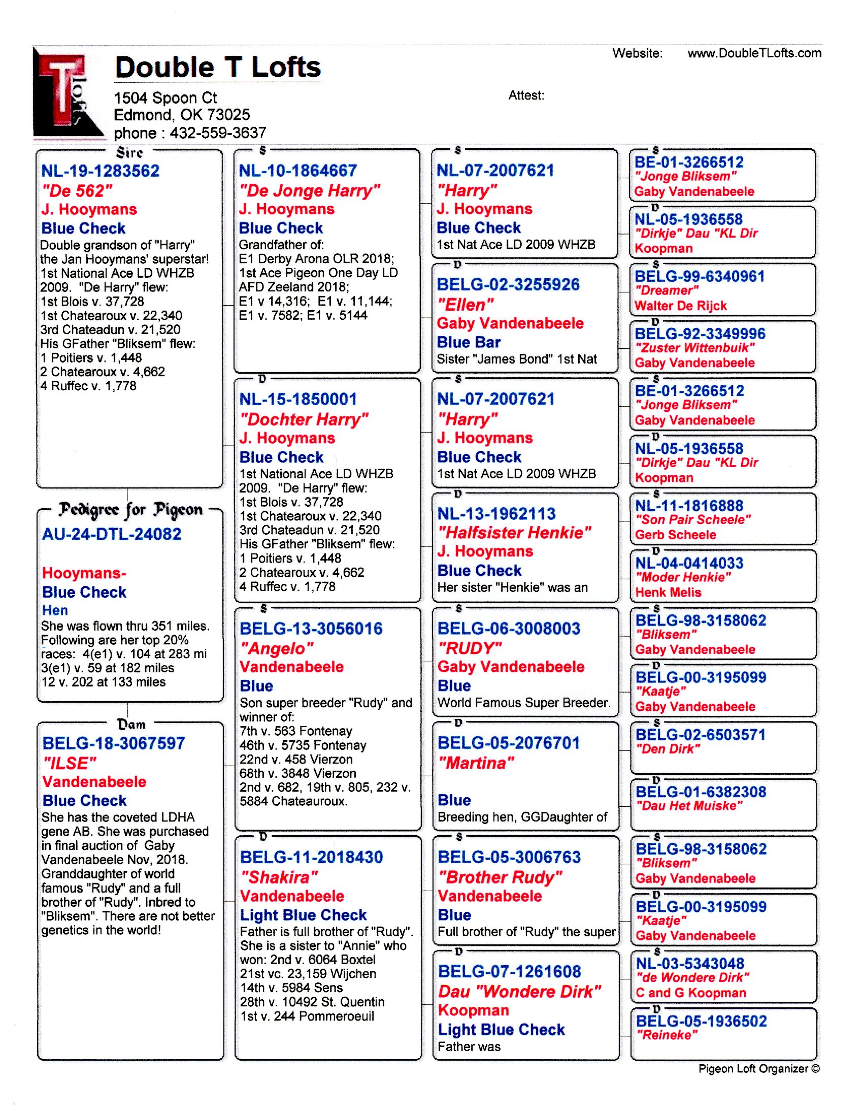 Sire: NL 19-1283562 "De 562" - A double grandson of Jan Hooyman's superstar "Harry" the 1st National Ace Long Distance 2009 WHZB and super breeder.