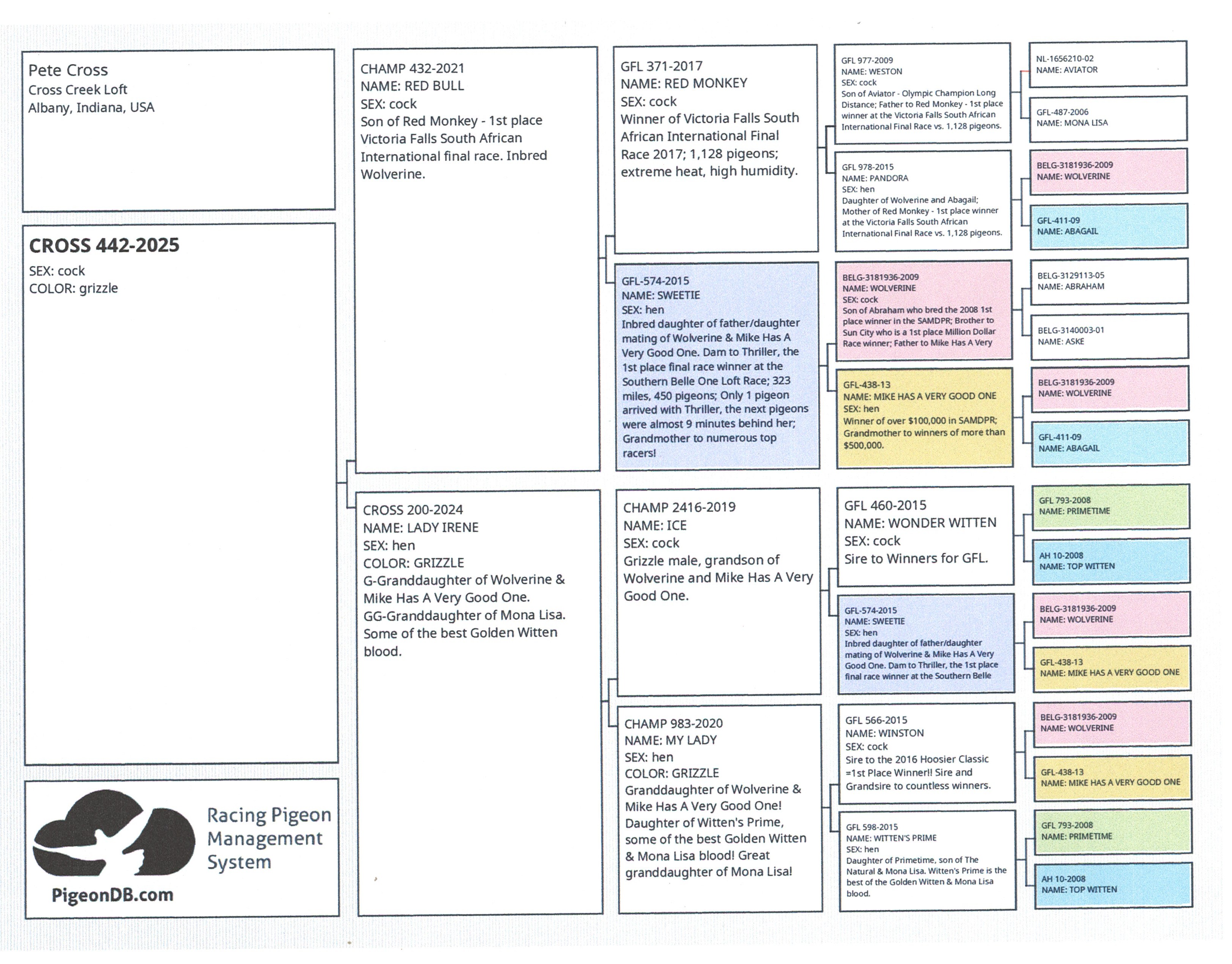 Father - Champ 432-2021, "Red Bull," purchased from Tim Lucas, Champ Camp Loft. Direct Son of Red Monkey 1st Place Victoria Falls winning $200k in prizes. Red Monkey Family has proven itself in many major one loft races around the world.