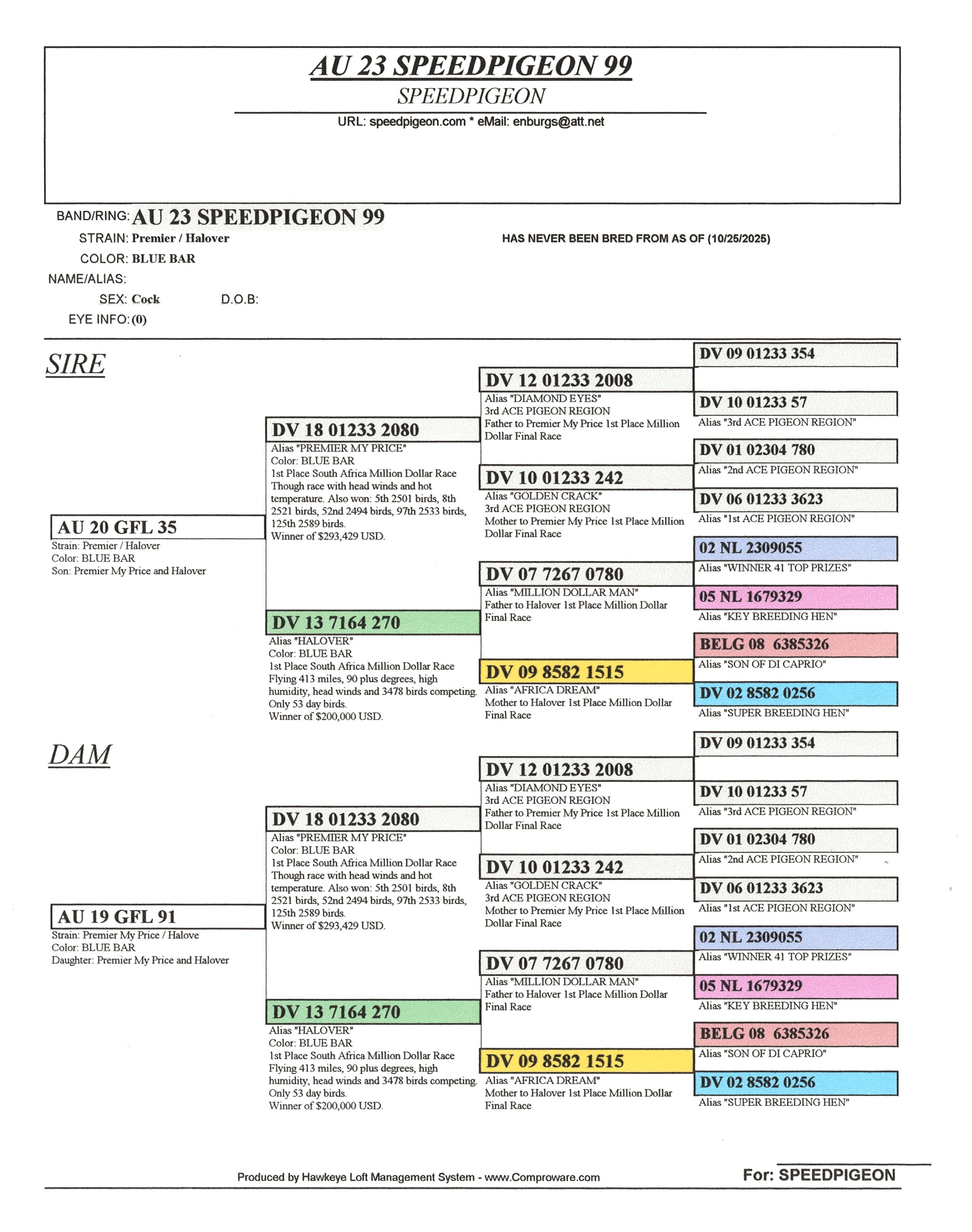 Speed Pigeon 99-2023, Cock - Inbred Gr. Son of Premier My Price x Halover