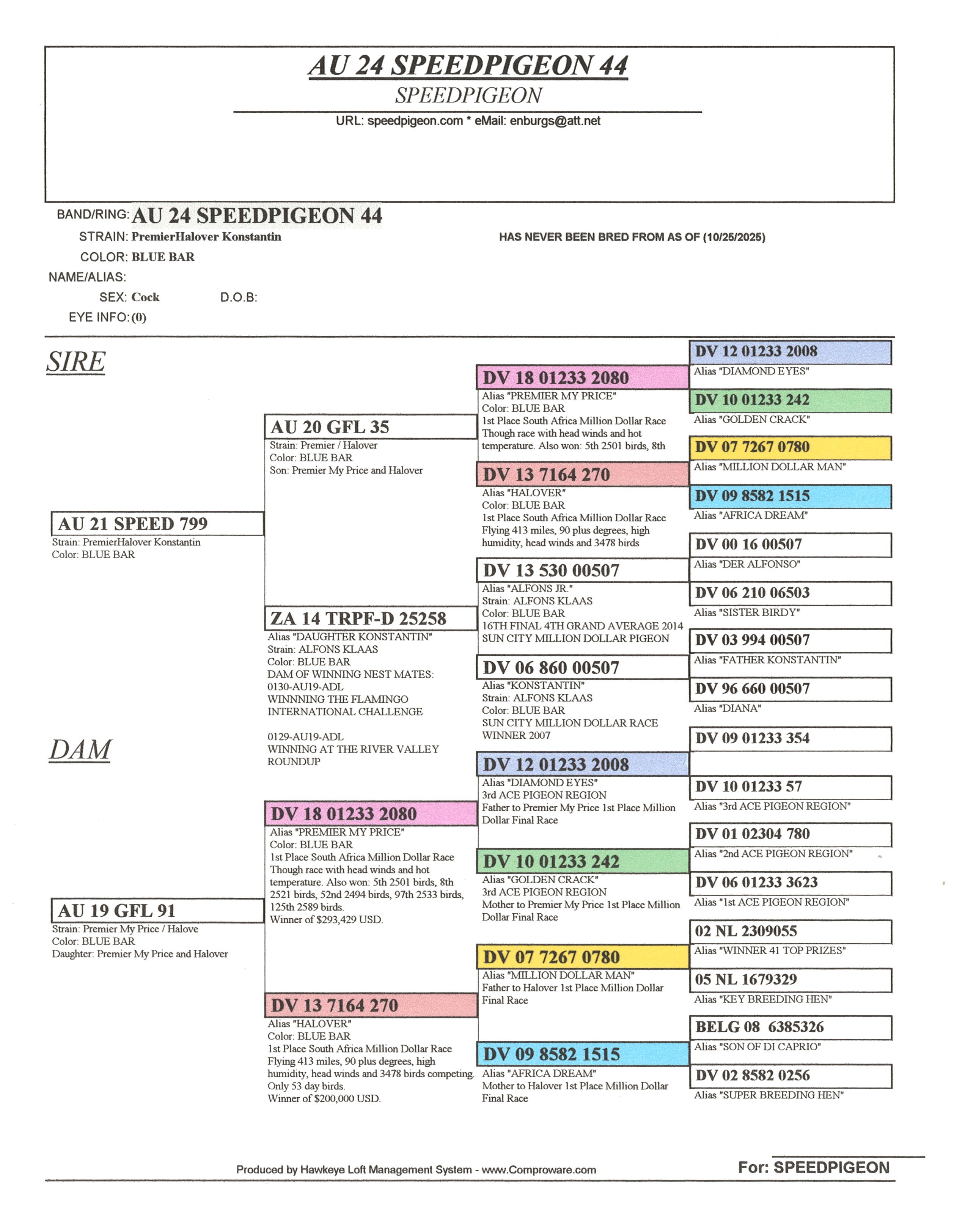 Father - GFL 35-2020, Direct son of 2 - 1st Place SAMDPR Winners. "Premier My Price," 1st Place SAMDPR - Premier won in a very tough race with head winds and hot temperatures. He had a great race record winning $293,429 in prizes: