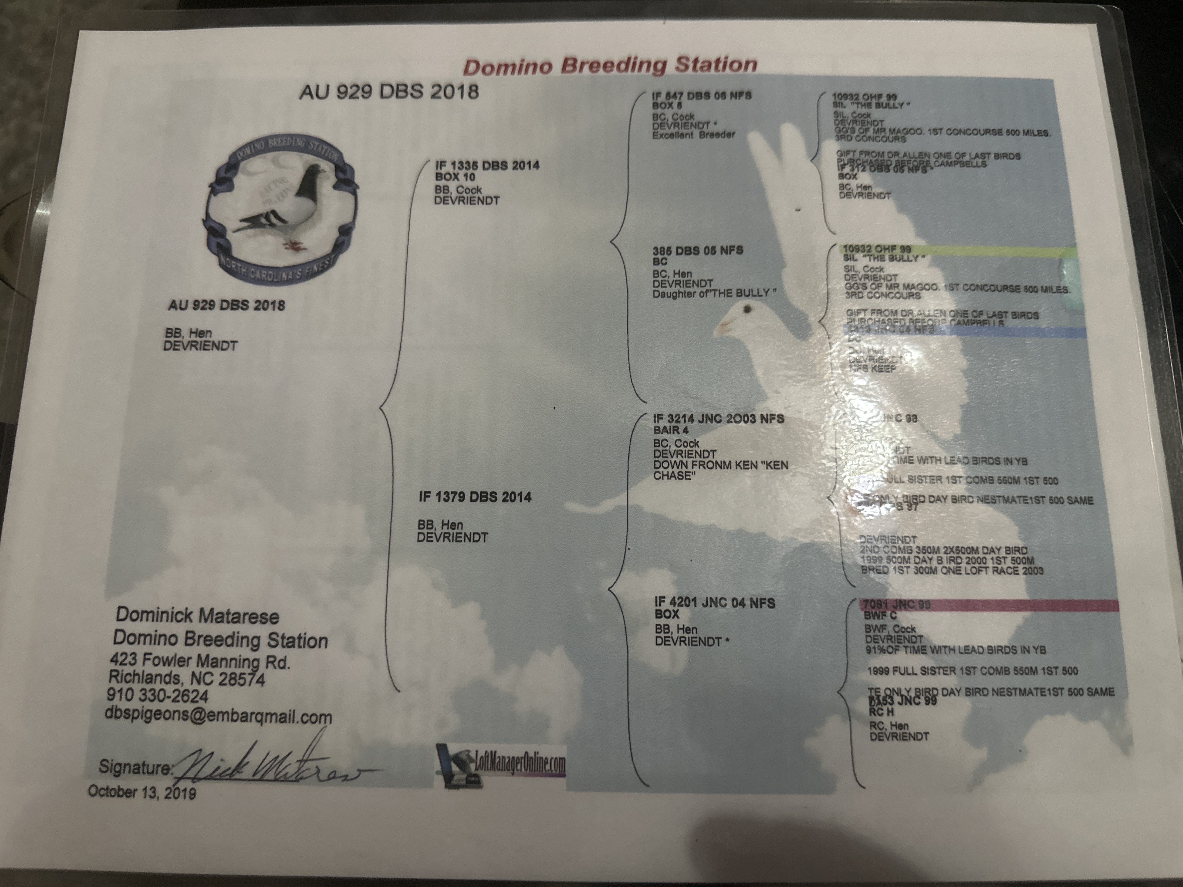 6th Place Champion Bird in the Erie Racing Pigeon Club. Her youngster was 1st in the 200 Miles race.