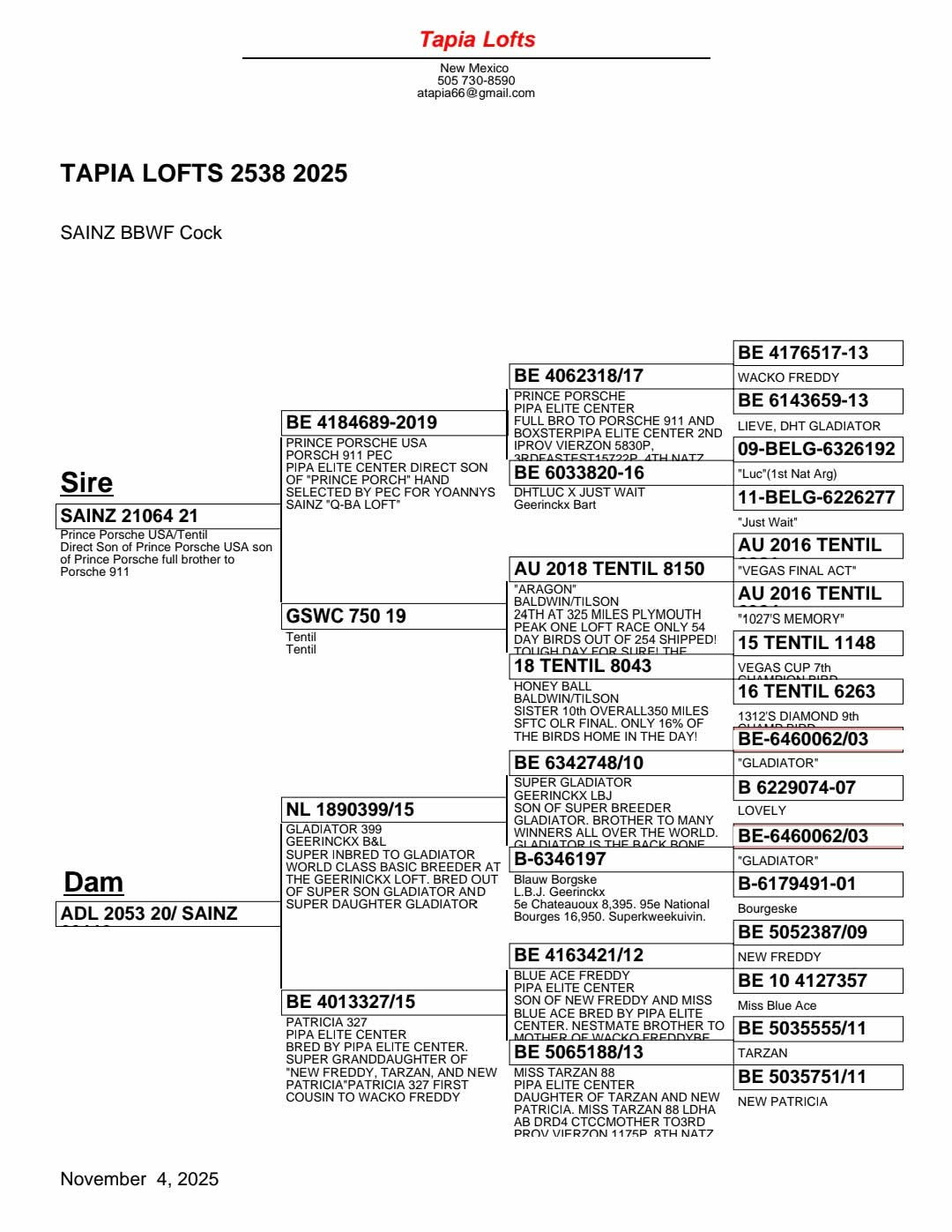 Looking at this pedigree is basically a who's who in the pigeon game. Porsche bloodlines, Baldwin/Tilson 1148 and 6263, along with Geerinckx Gladiatior blood from Sainz lofts. This is a super young cock bird, do not miss this bird as breeding season approaches!