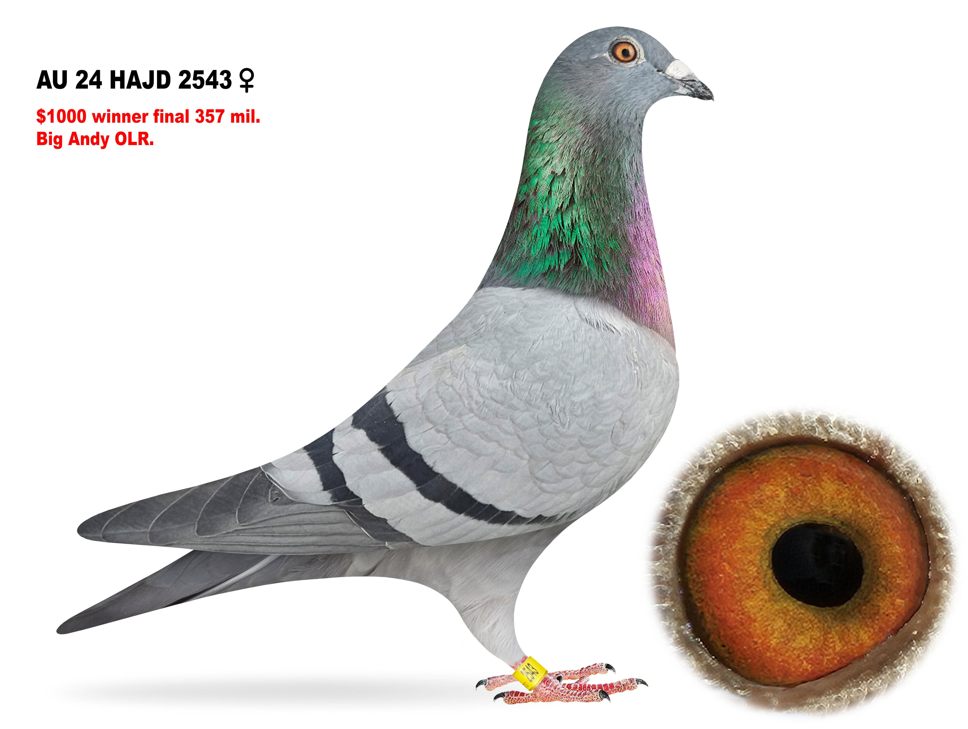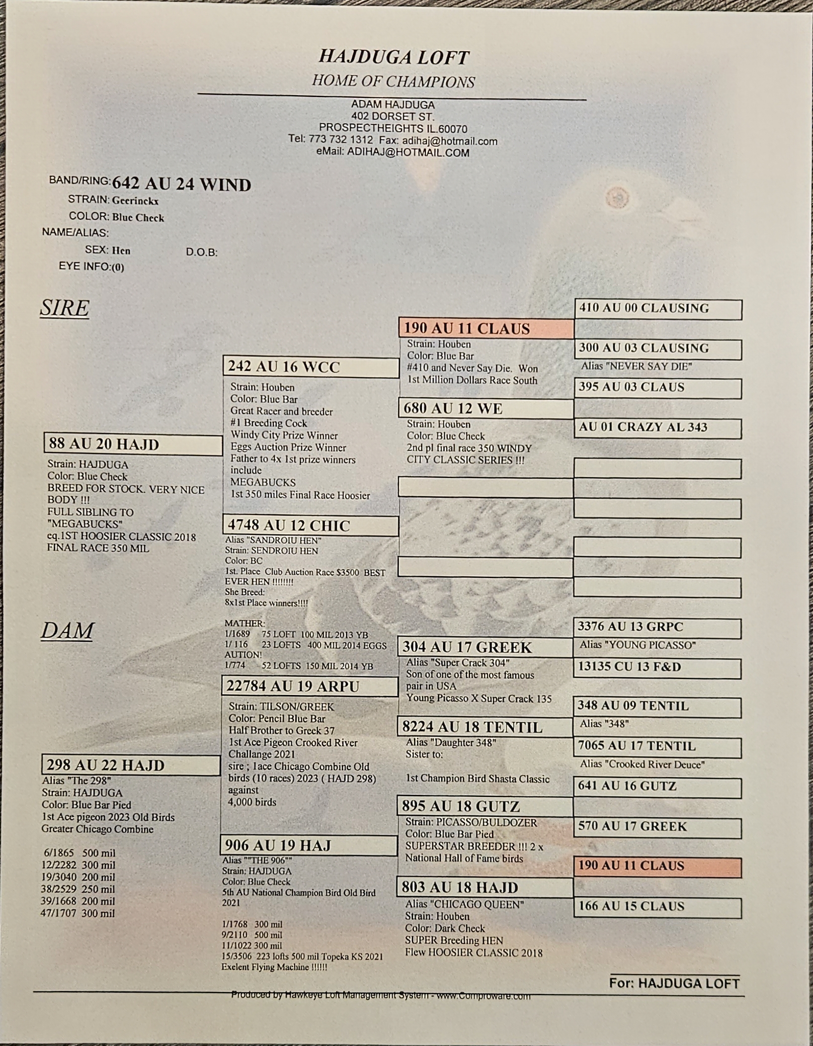 Dam : Hajd 298 , Proven breeder , multiple $$$$ and race winners , one of our best breeding hens.