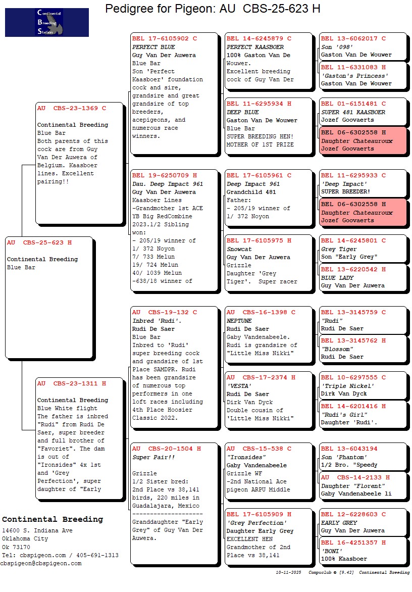 Dam: The father is inbred "Rudi" from Rudi De Saer, super breeder and full brother of "Favoriet". The dam is out of "Ironsides" 4x 1st and 'Grey Perfection', super daughter of "Early Grey".