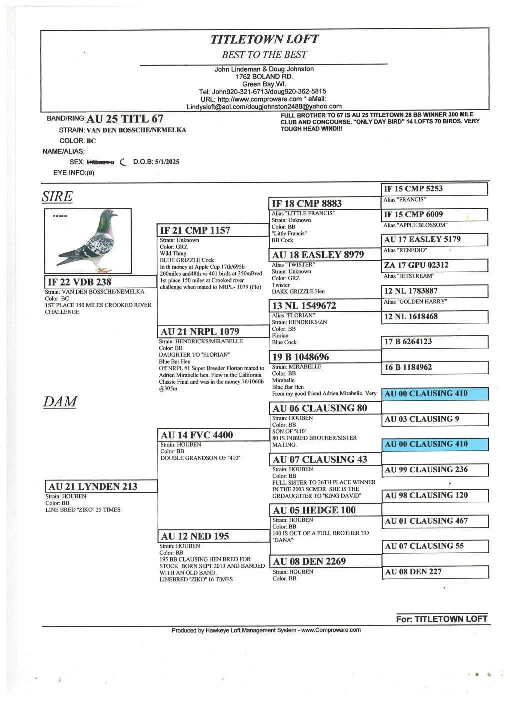 DAM: AU 21 LYNDEN 213 BB ( HOUBEN) FULL BROTHER TO 67 IS AU 25 TITLETOWN 28 BB WINNER 300 MILE CLUB AND CONCOURSE. "ONLY DAY BIRD" 14 LOFTS 70 BIRDS. VERY TOUGH HEAD WIND!!!