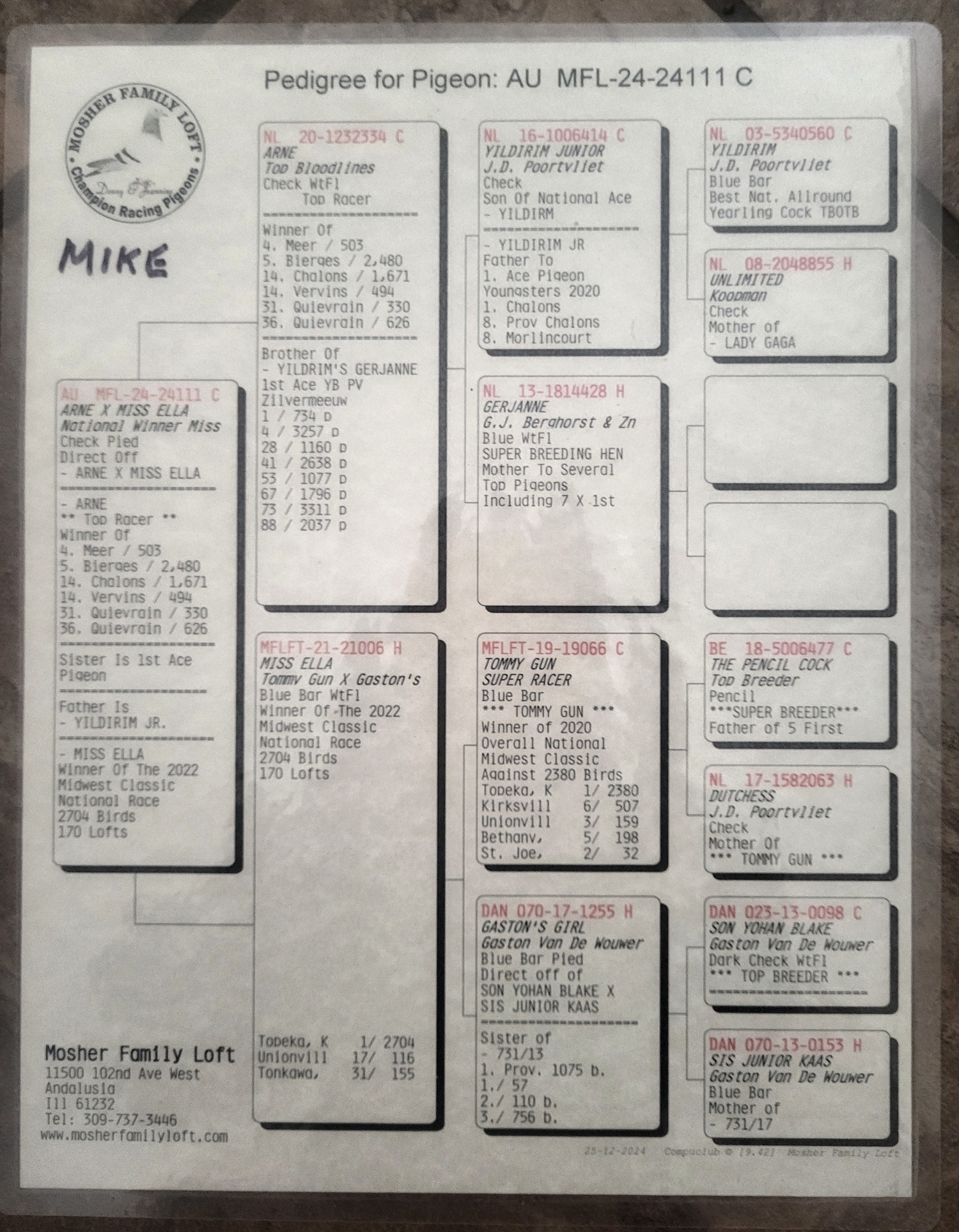 Pedigrees include: Ken Easley & Son • David Clausing • Mosher Family Loft • Nanez Family Loft • Romanian Dave