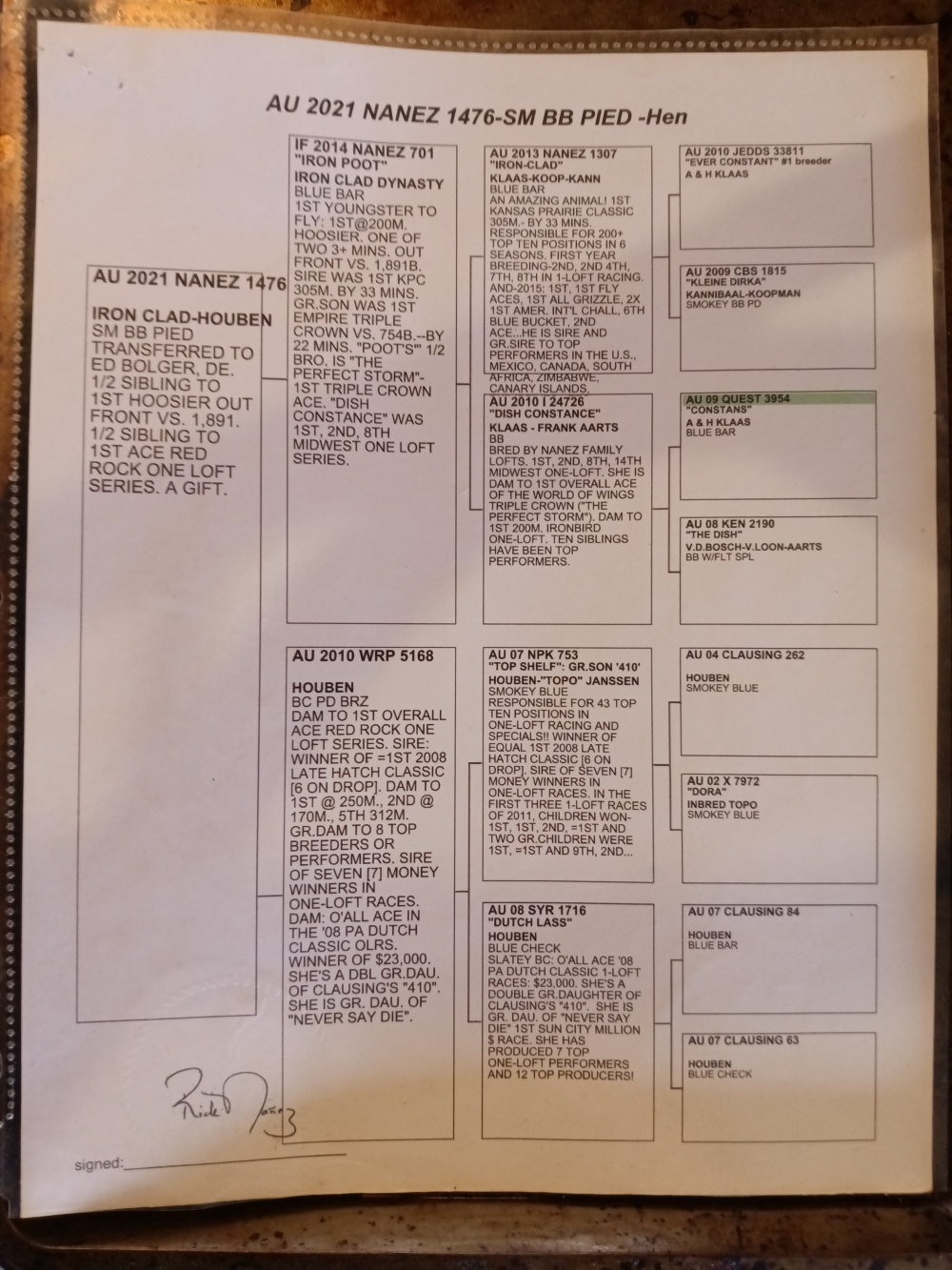 Solid, beautiful late hatch 2025 hen from Rick Nanez’s Iron Clad Houben line, sibling to the first Hoosier out front and first ace bird, paired to a Mosher Loft cock out of the proven Arne x Miss Ella pair. This young hen brings together two powerhouse families known for speed, endurance, and consistency on race day. Pedigrees speak for themselves!