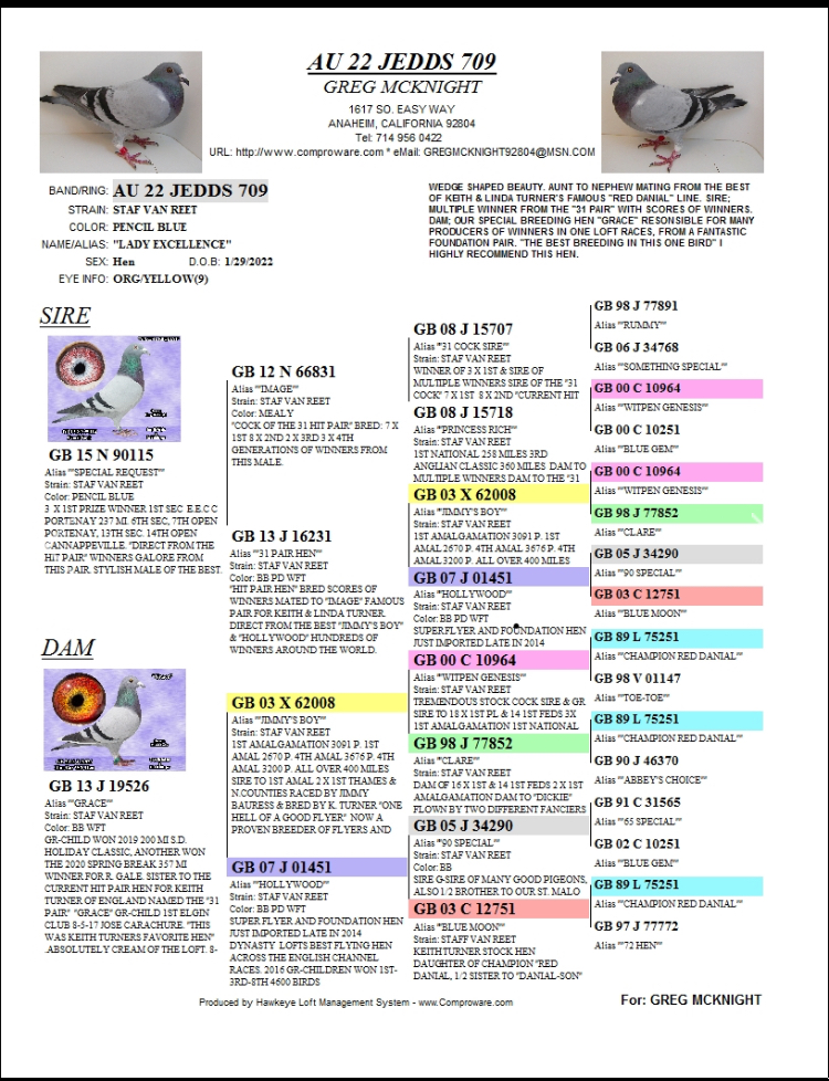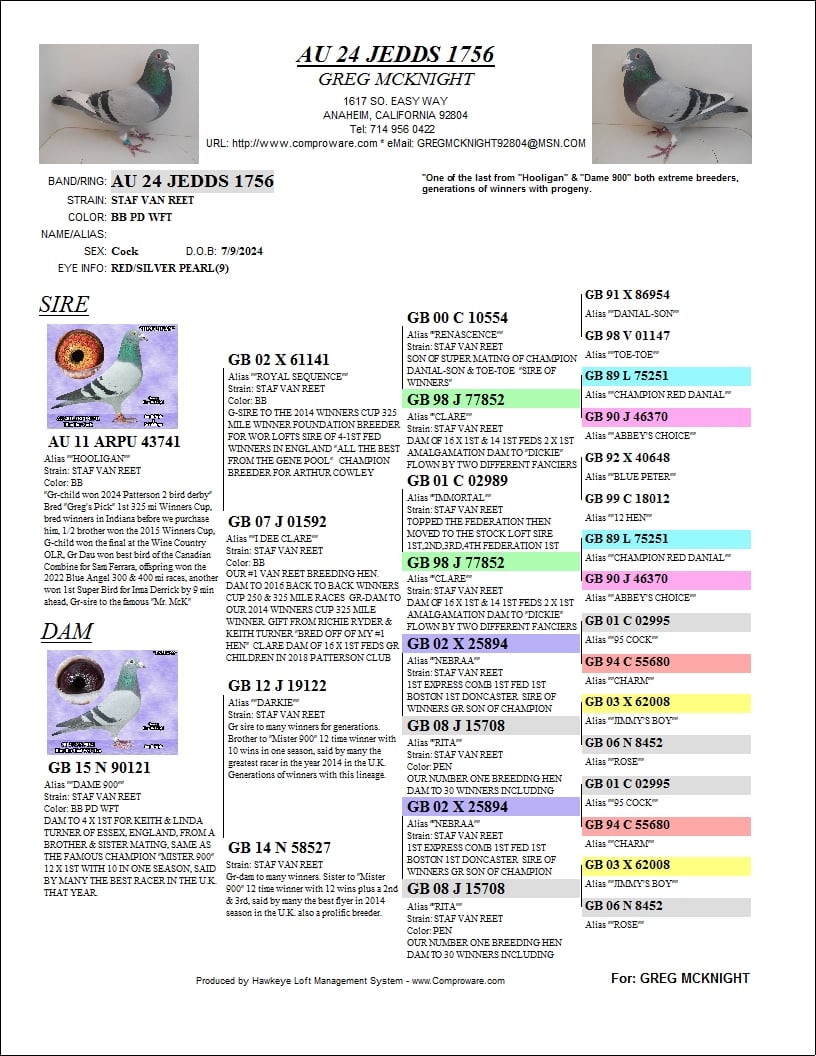 well what I have here is a grandson of holligain amazing Greg McKnight blood ..bird out of the SON of holligan and lady excellence it's a really nice bird would make a great foundation for anyone's lift..winning bloodline every in the pedigree...