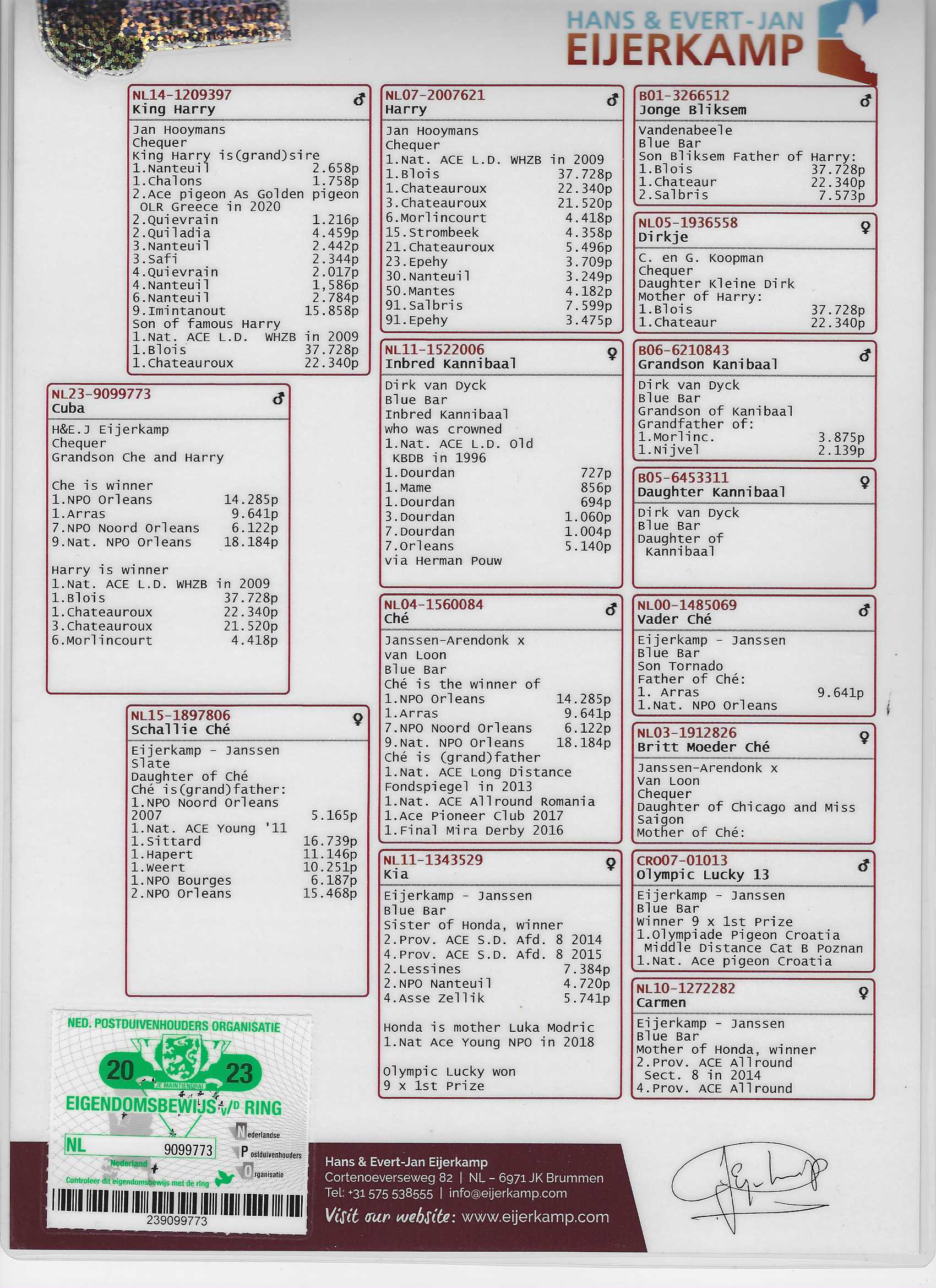 He is the son of the 9 year old top breeder, King Harry; King Harry is a son of Harry – with Kannibaal Blood added in. (“Kannibaal homed so fast he risked injuring himself!”) Added to that is the Eijerkamp Top Van Loon Blood through the great Che’.