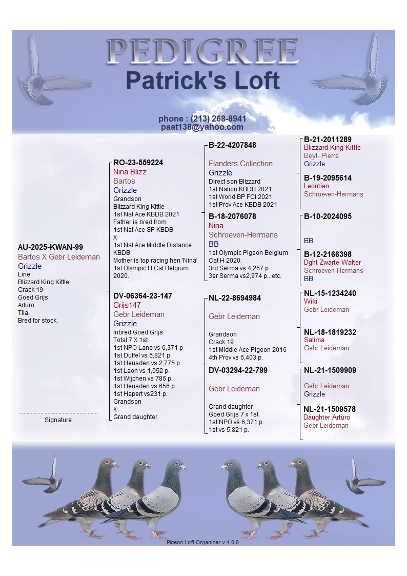 AU-2025-KWAN-99 grizzle, sex unkonwn,medium in size, well built,sire is a grandson of Blizzard King Kittle, dam is a line bred to Leideman Goed Grijs,check pedigree for more info