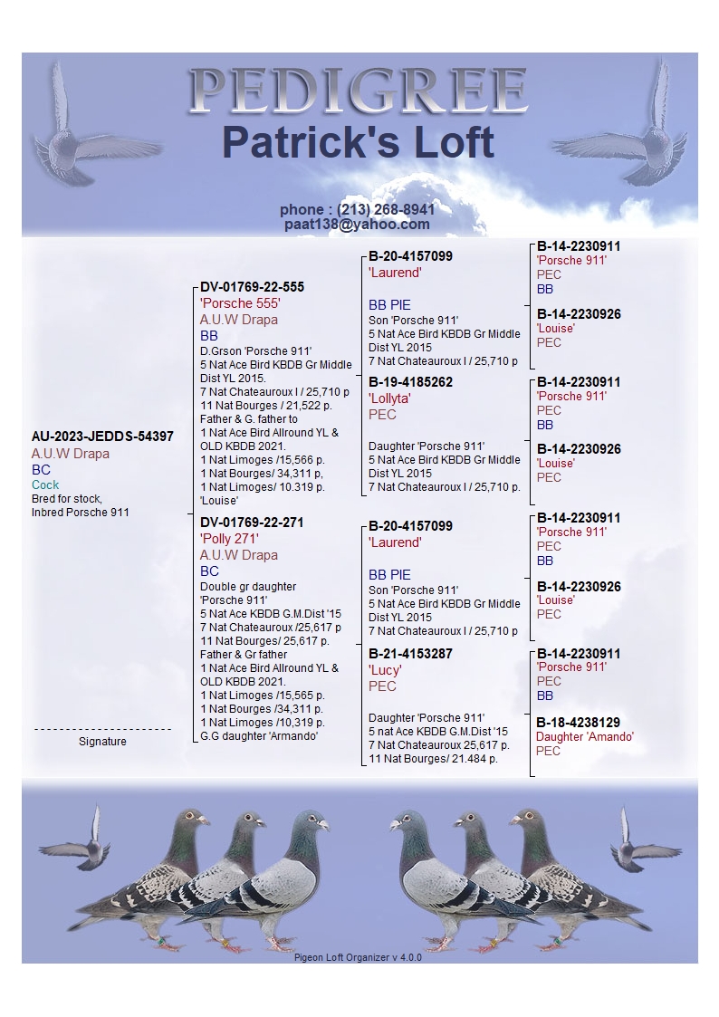 AU-2023-JEDDS-54397 bc,medium in size,nice confirmation,double grandson X double grand daughter Porsche 911, one of the best strain for OLR,foundation quality,check ped for more info.