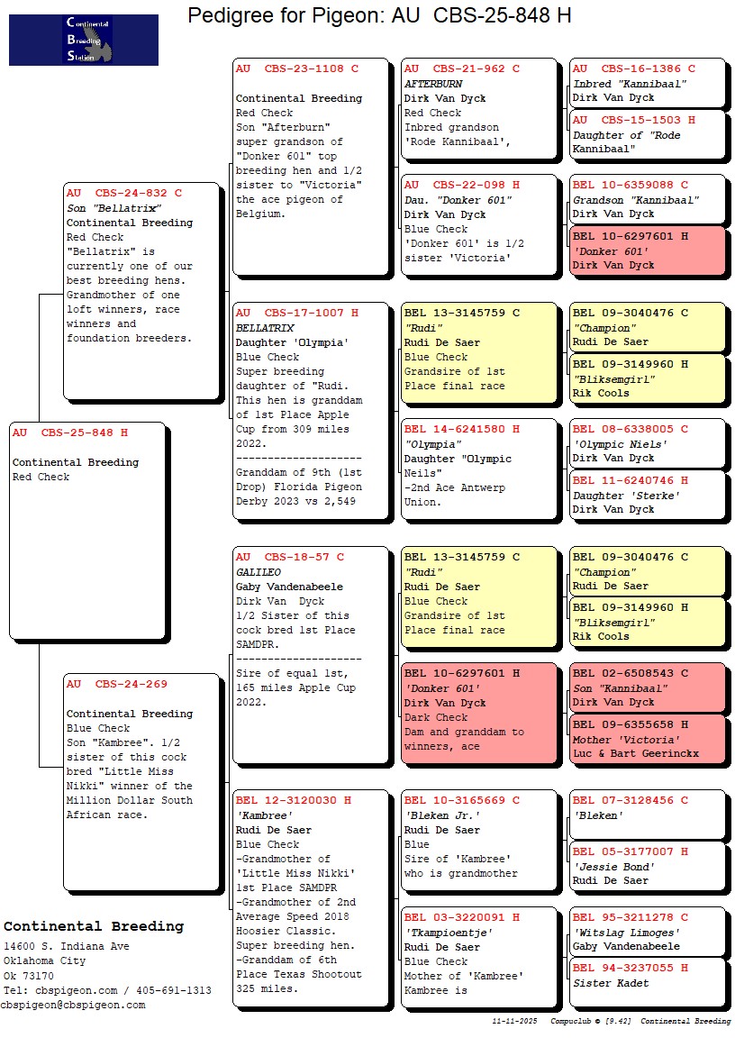 Sire: Son "Bellatrix". "Bellatrix" is currently one of our best breeding hens. Grandmother of one loft winners, race winners and foundation breeders.