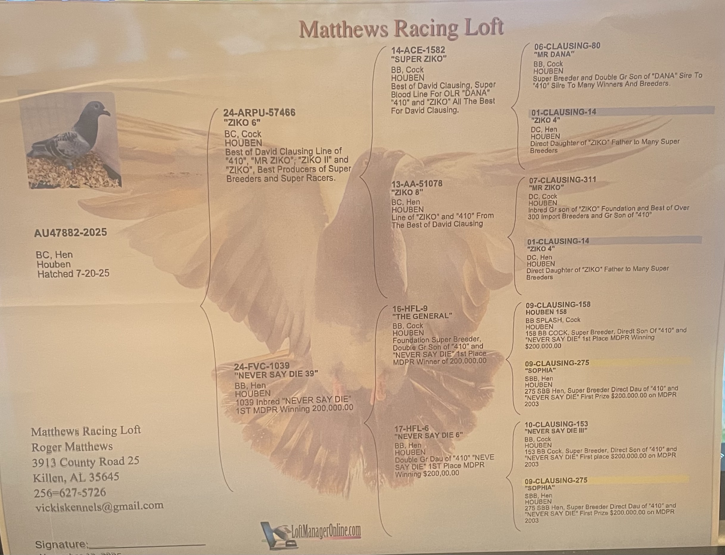 Super young hen bred down from Ziko and Never Say Die, never been flown. Sex not guaranteed