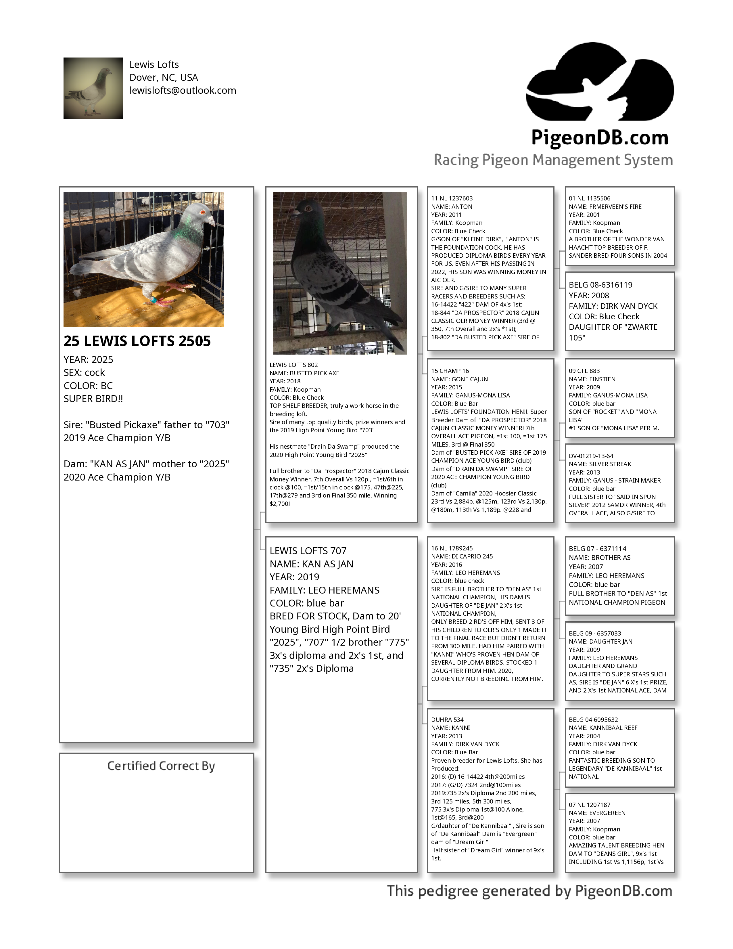 Sire: "BUSTED PICKAXE" father to "703" 2019 Ace Champion Y/B
