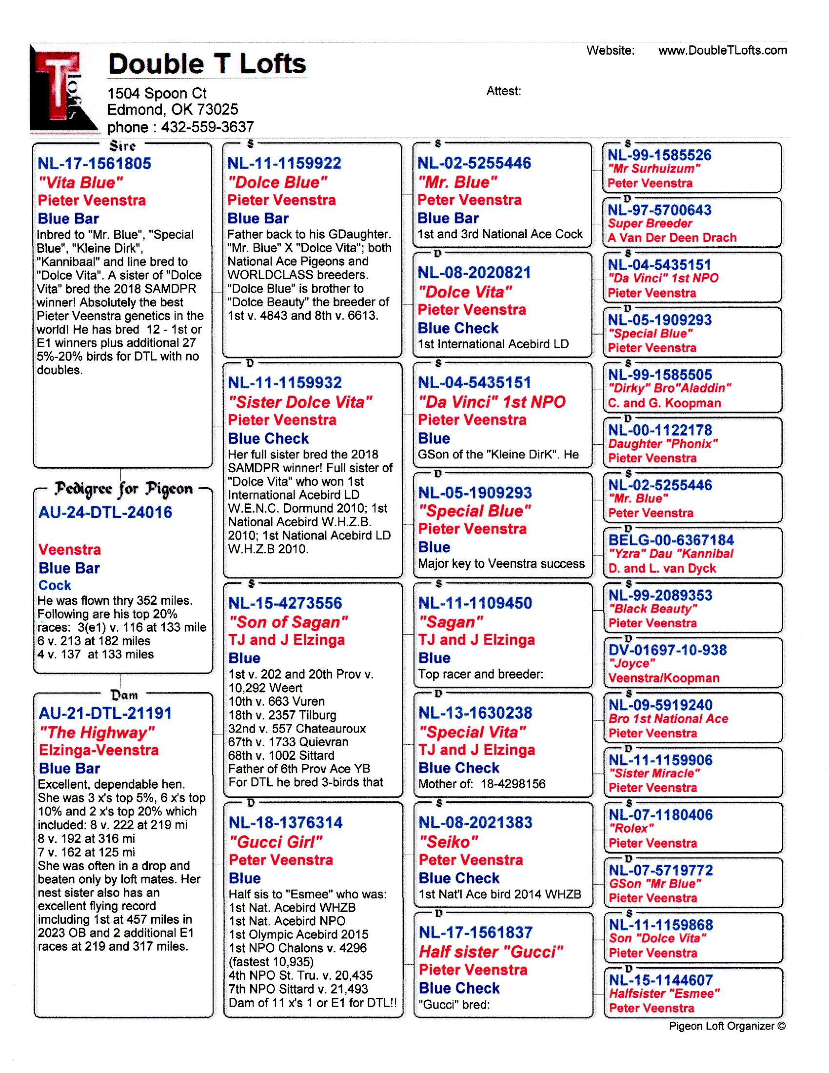 Dam: AU-21-DTL-21191 “The Highway” – Pieter Veenstra via TJ & J Elzinga. An excellent flyer moved to the stock loft. She was E1 at 317 miles and 3 x’s top 5%; 6 x’s top 10% and 2 more x’s top 20%. Her nest sister won at 457 miles in 2023 OBs.