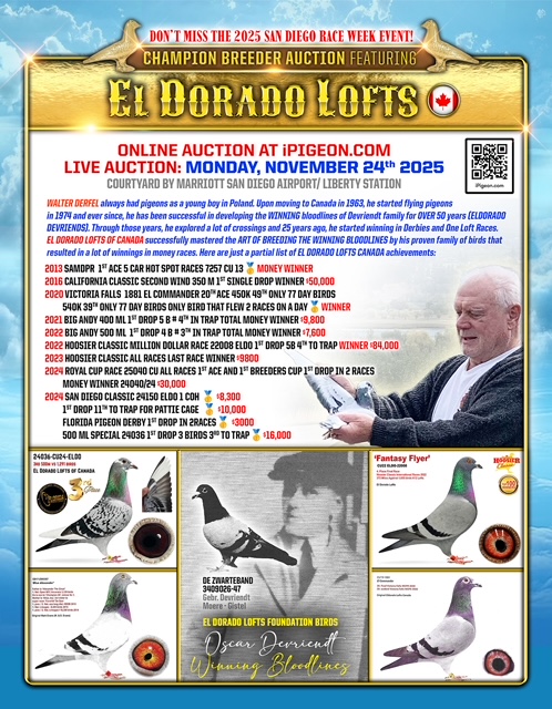 Walter Derfel of El Dorado Lofts has been a fixture in the San Diego racing scene since the early 1990s. Over the years Walt has scored in The Triple Crown, The San Diego Holiday Cup, California Classic, and Royal Cup. Through decades of work Walt has developed a family of birds that consistently performs on this course. In addition to his success in San Diego Walt has also earned top results in other OLRs across the country.This auction includes birds from proven breeders and racers that have excelled on this racecourse. Please see the flyer for more details and highlights.