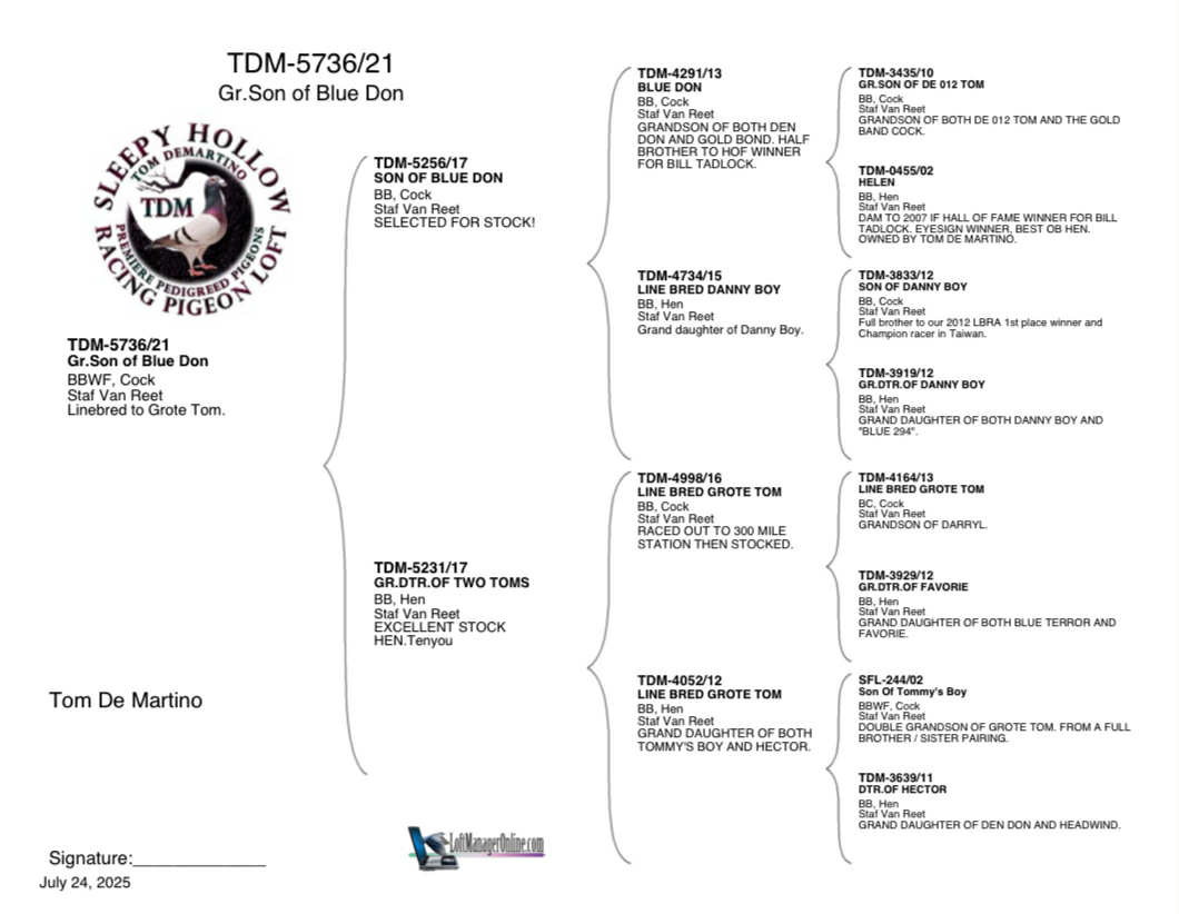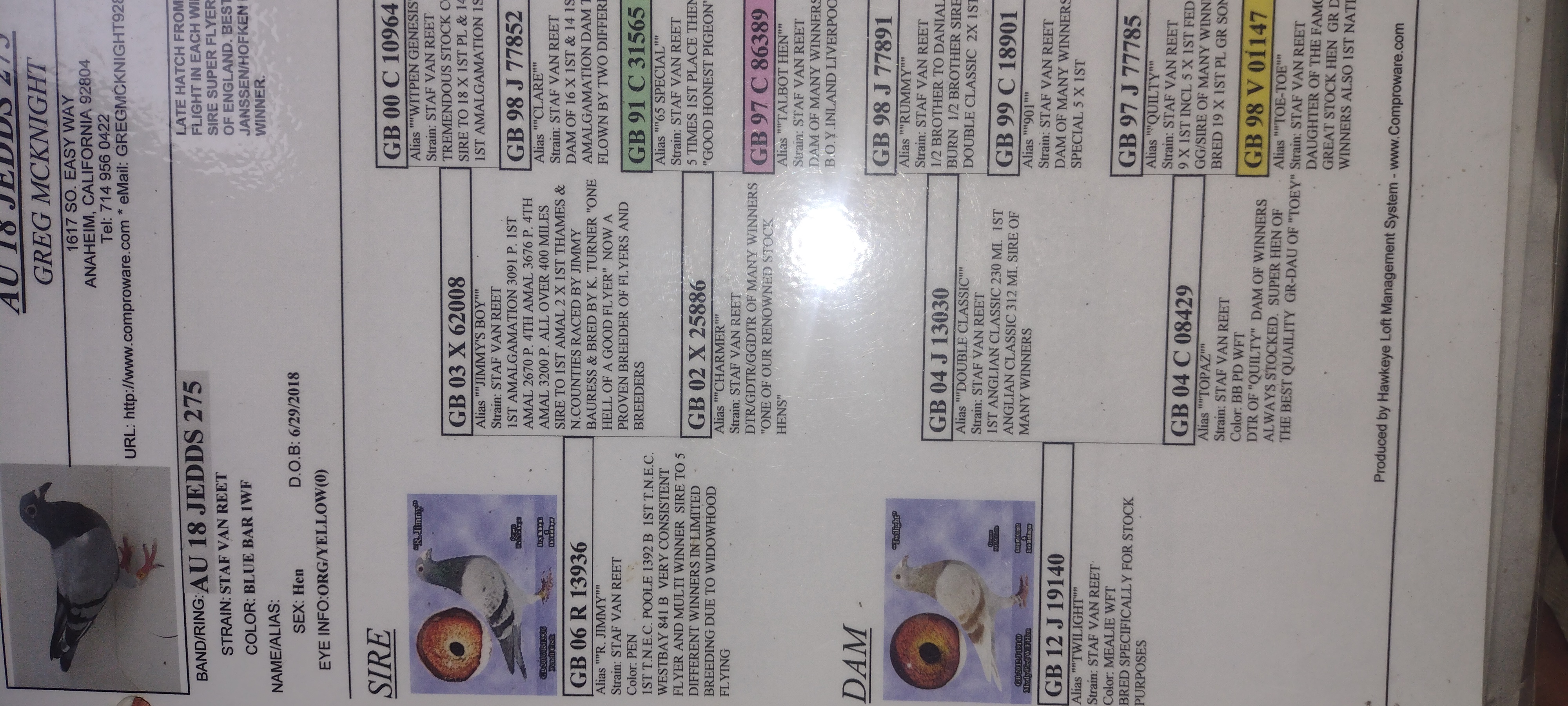 WHAT I HAVE HERE IS A AMAZING FLYER FOR ME IN 2024 HE FLEW EVERY WEEK EVERY RACE AND WAS JUST A GREAT BIRD..HANDLES LIKE A DREAM THIS COCK BIRD HAS TIGHT VENT STRONG BACK AND SMOOTH I WAS VERY PLEASED WITH HIM I STOCKED HIM FALLTIME OF 2024 BUT JUST NO ROOM AND IM RELOCATING..A LOT OF WINNING BLOOD IN THIS BIRDS FROM FIRST PLACE CHAMPS FROM TOM DE MARTINO TO GREG MCKNIGHTS RED DANIEL DYNASTY..IF ANY QUESTIONS alemanjoe31@gmail.com..bid with cofedince and thank you for checking out my birds