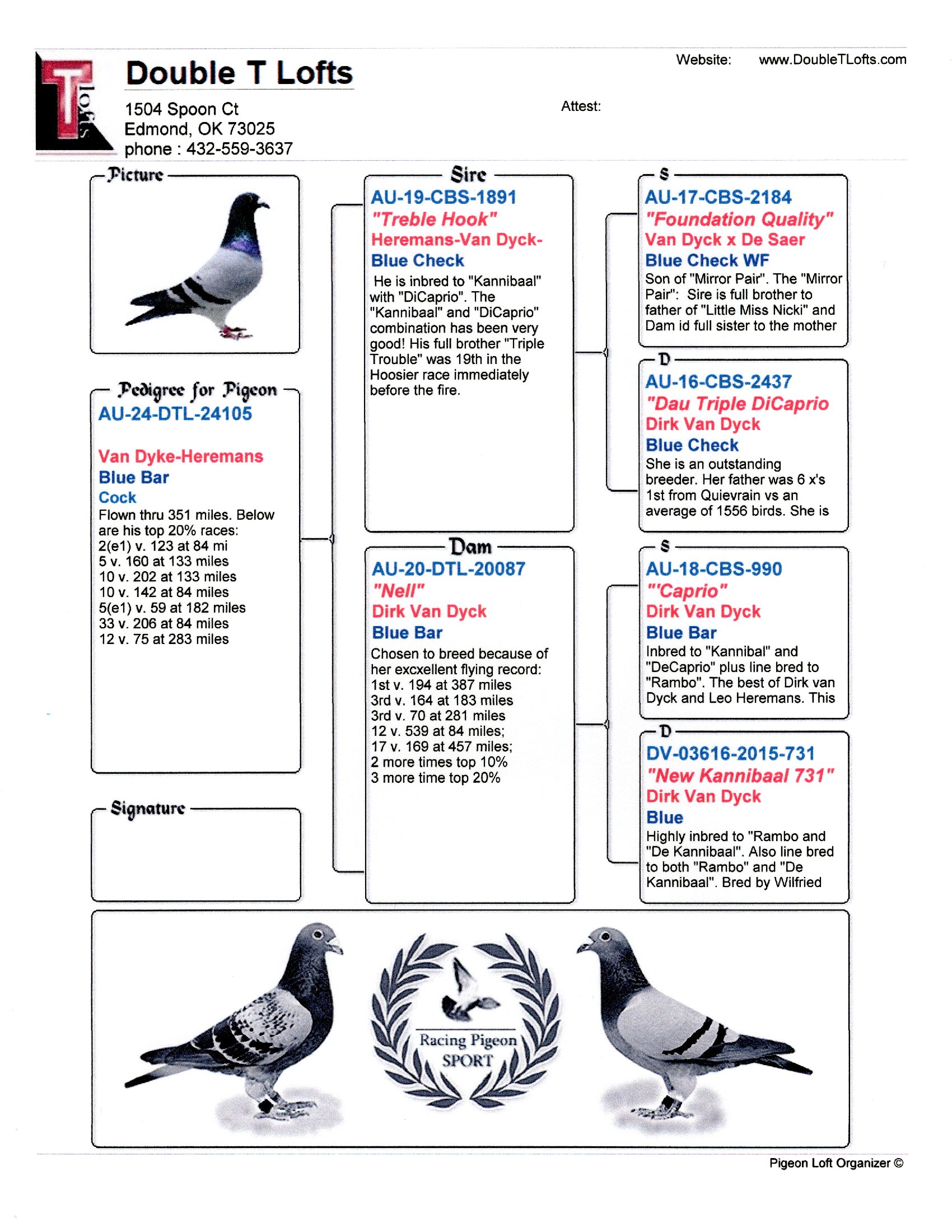 AU-24-DTL-24105 BB - This excellent handling cock is medium in size. He has a good back, tight vents and 1-pin tail. He was flown through 351 miles. Following are his top 20% race positions: