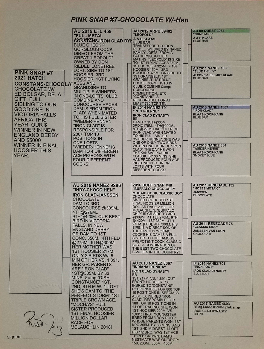 This beautiful hen carries serious performance genetics. She is bred from the Romania Dave Pure Detroit Bekaert line, paired with the elite Rick Nanez “FULL METAL JACKET” line, a family loaded with Hoosier and New England winners, descending directly from powerhouse breeders “CONSTANS” and “IRON CLAD.”