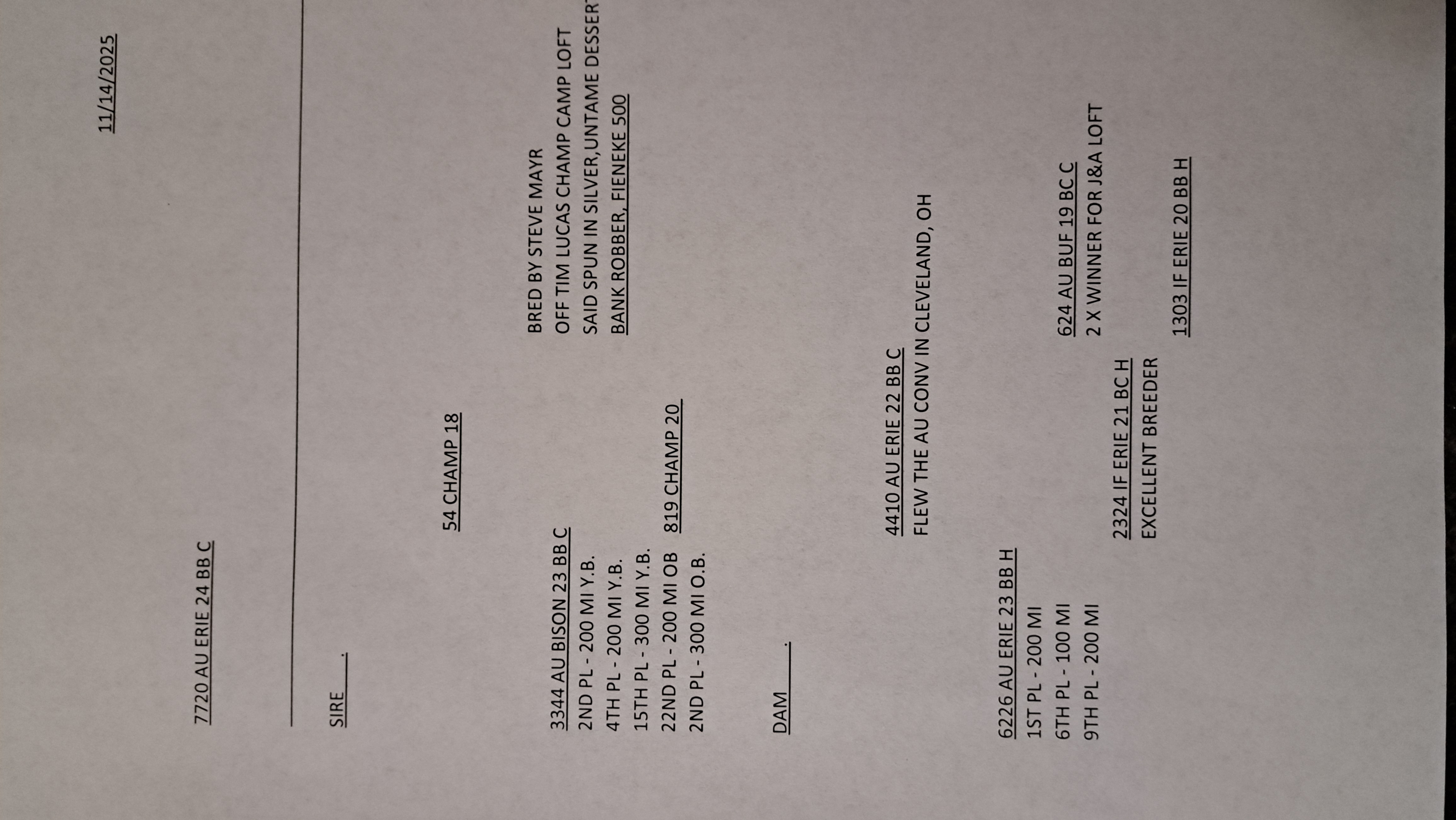 His father is 3344 AU BISON 23 BB C, bred by Steve Mayr. Flown by me. 2nd - 200 mi yb, 4th - 200 mi, 15th - 300 mi yb, 22nd - 200 mi ob, 2nd - 300 mi ob.