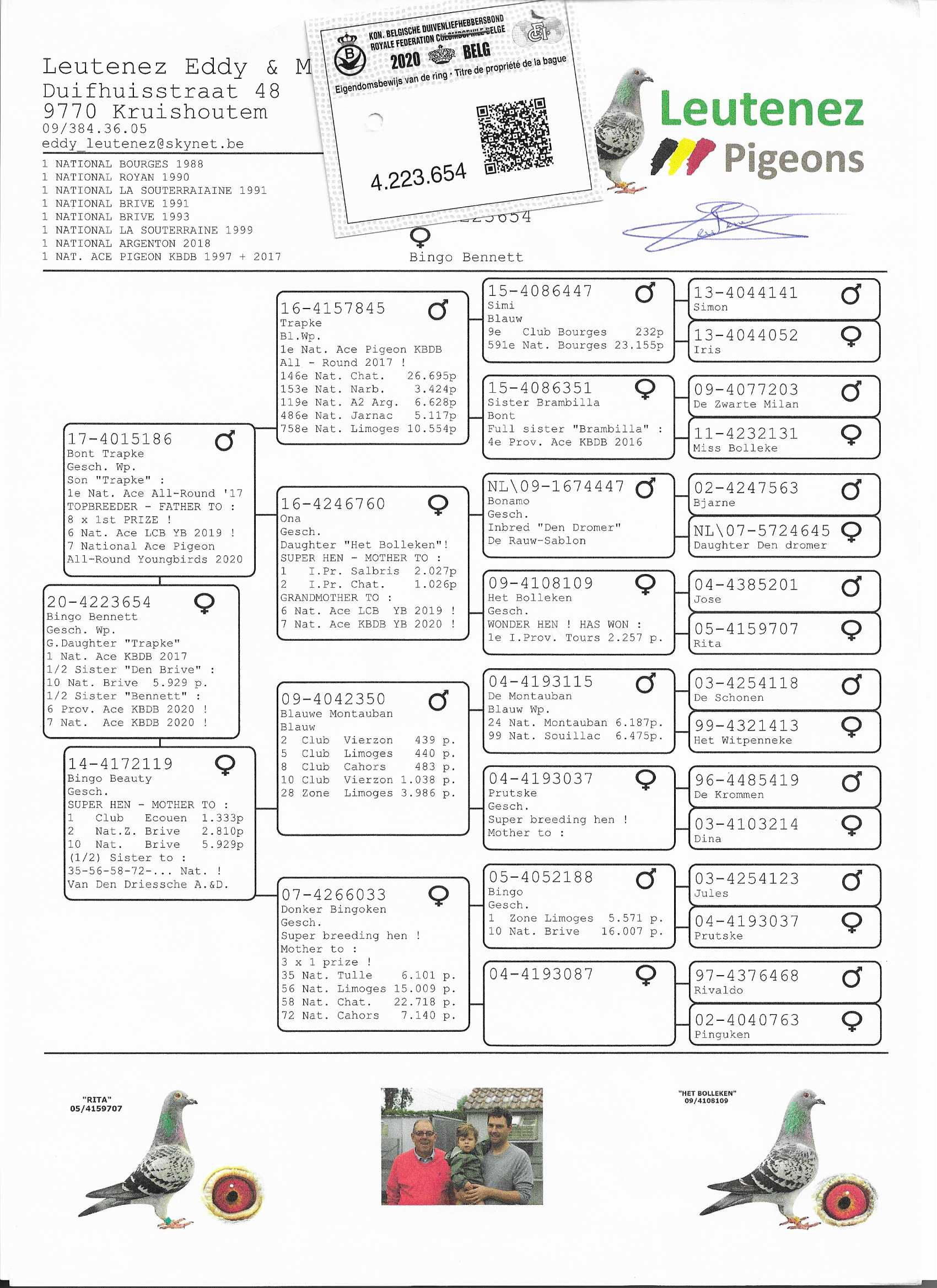PIGEON FROM NATIONAL FAMILY WINNERS .LEUTENEZ FAMILY IS ONE OF THE BEST NATIONAL BREDERS IN BELGIUM YOU CANNOT GO WRONG WITH THIS PIGEON .FOR MORE INFO LOOK AT THE PEDIGREE