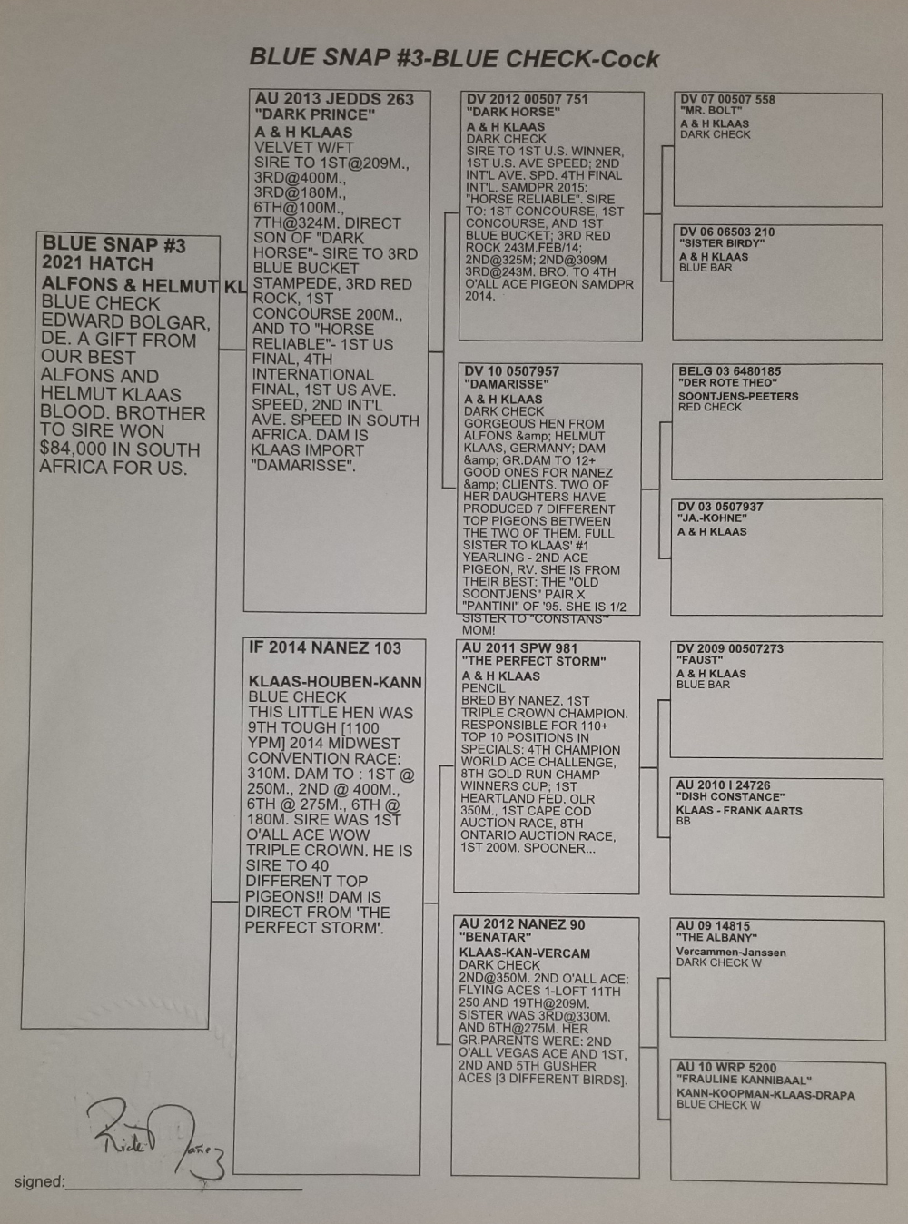 This cross combines the drive and heart of the Clausing line with the strength and long-distance stamina of Nanez’s proven Alfons Helmut blood an exceptional foundation for your future race team or breeding loft.