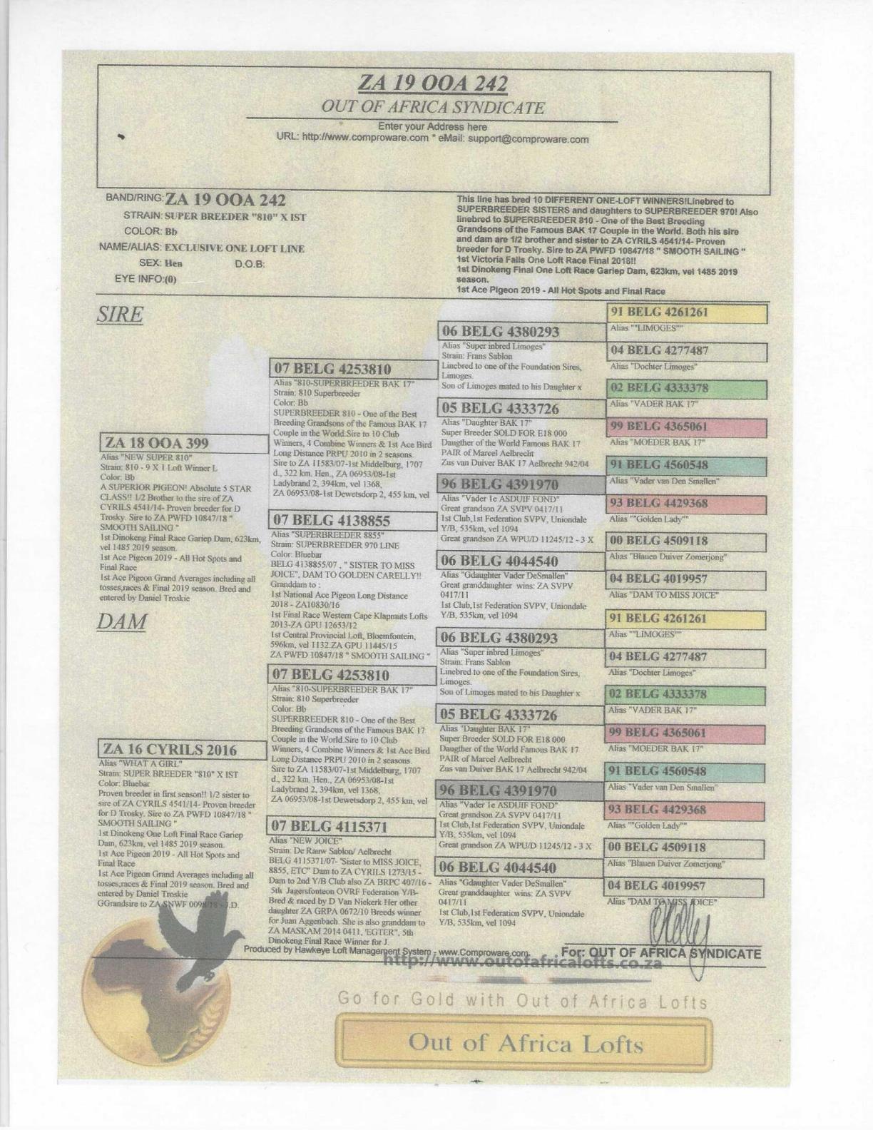 DE-RAUW SABLON BRED IN SOUTH AFRICA FROM THEIR BEST ONE LOFT RACE FAMILY LINE. HE IS MEDIUM SIZED, NICE AND BUOYANT WITH NICE BALANCE AND FEATHER. A VERY NICE COCK WITH PROVEN ONE LOFT RACE WINNING BACKGROUND. HE IS IN USA AND ARRIVES TO YOU WITHOUT ANY EXTRA IMPORT FEES... FOR ANY QUESTIONS: bbcoach@windstream.net NEW ERA LOFT