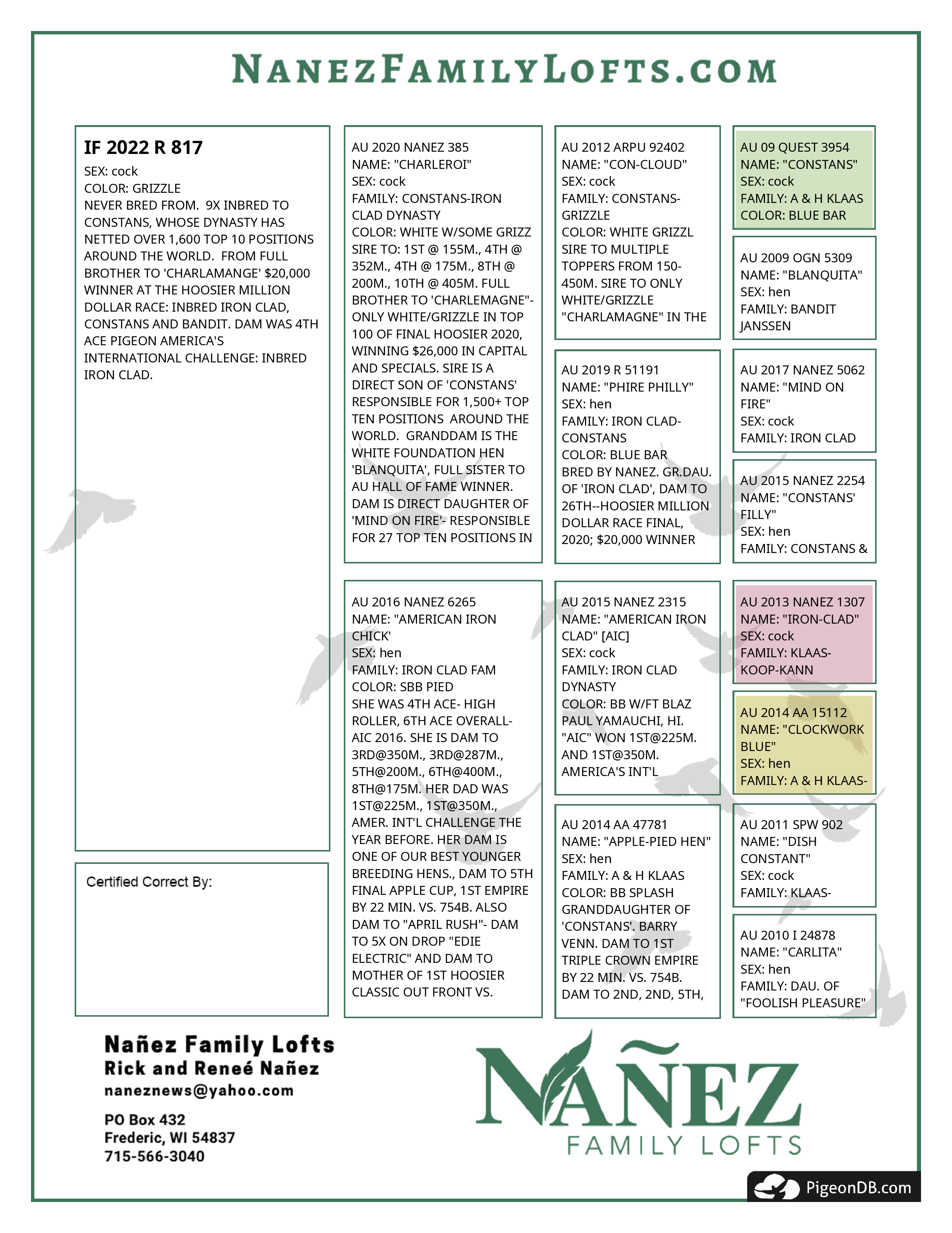 SIRE TO: 1ST @ 155M., 4TH @ 352M., 4TH @ 175M., 8TH @ 200M., 10TH @ 405M. FULL BROTHER TO 'CHARLEMAGNE"- ONLY WHITE/GRIZZLE IN TOP 100 OF FINAL HOOSIER 2020, WINNING $26,000 IN CAPITAL AND SPECIALS. SIRE IS A DIRECT SON OF 'CONSTANS' RESPONSIBLE FOR 1,500+ TOP TEN POSITIONS AROUND THE WORLD. GRANDDAM IS THE WHITE FOUNDATION HEN 'BLANQUITA', FULL SISTER TO AU HALL OF FAME WINNER. DAM IS DIRECT DAUGHTER OF 'MIND ON FIRE'- RESPONSIBLE FOR 27 TOP TEN POSITIONS IN ONE LOFT RACING.