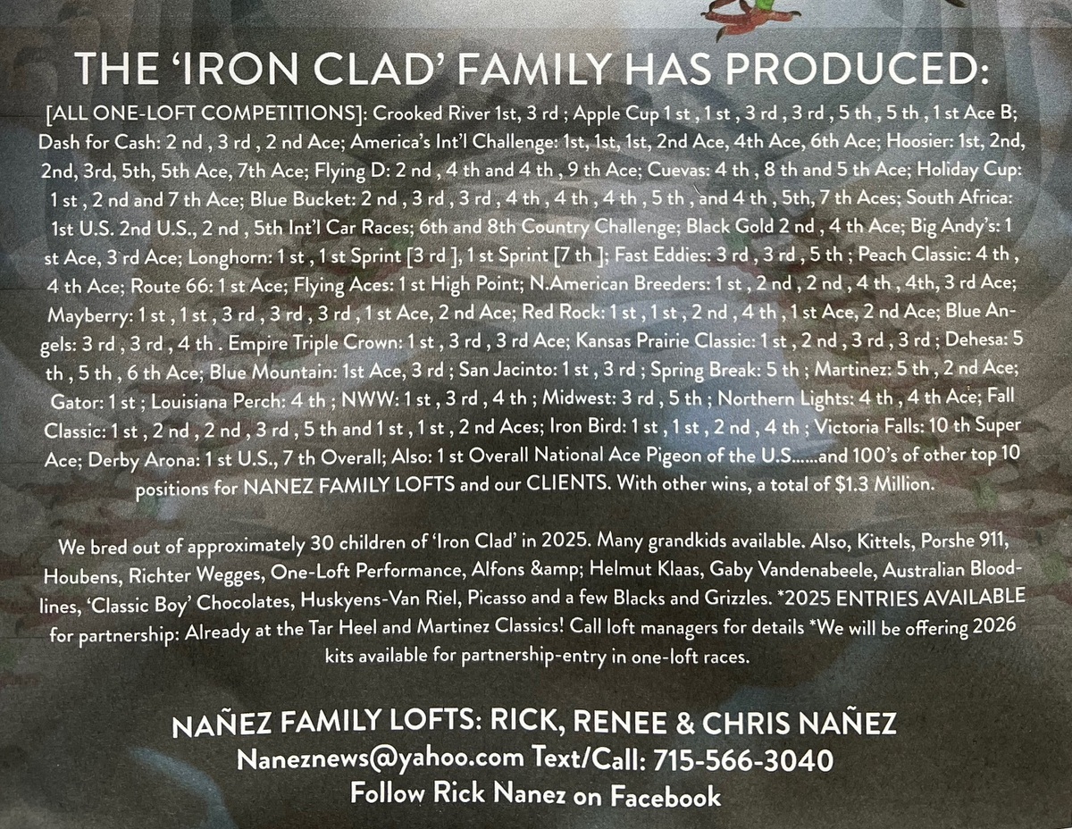 NANEZ FAMILY LOFTS WINS: 4TH OVERALL ACE PIGEON HOOSIER MILLION DOLLAR RACE SERIES: ON THE DROP- FINAL.