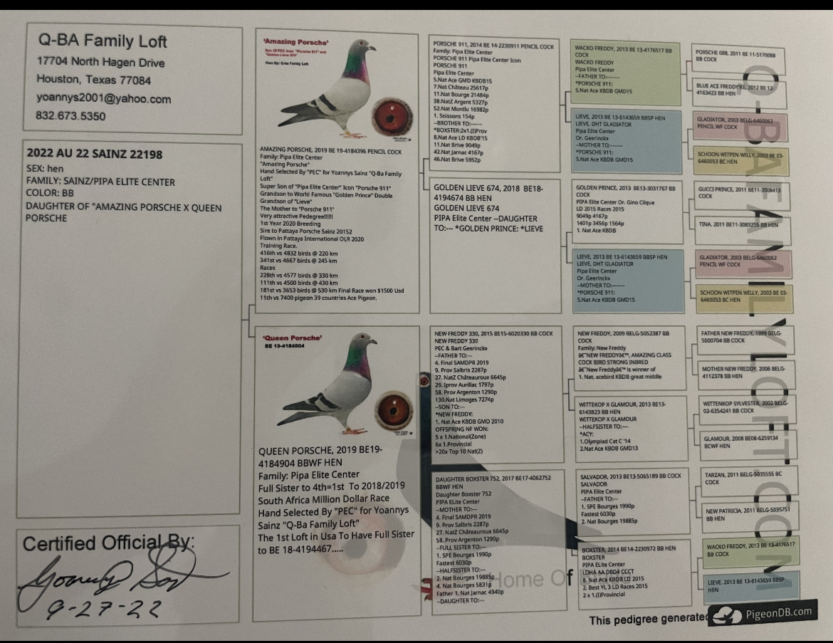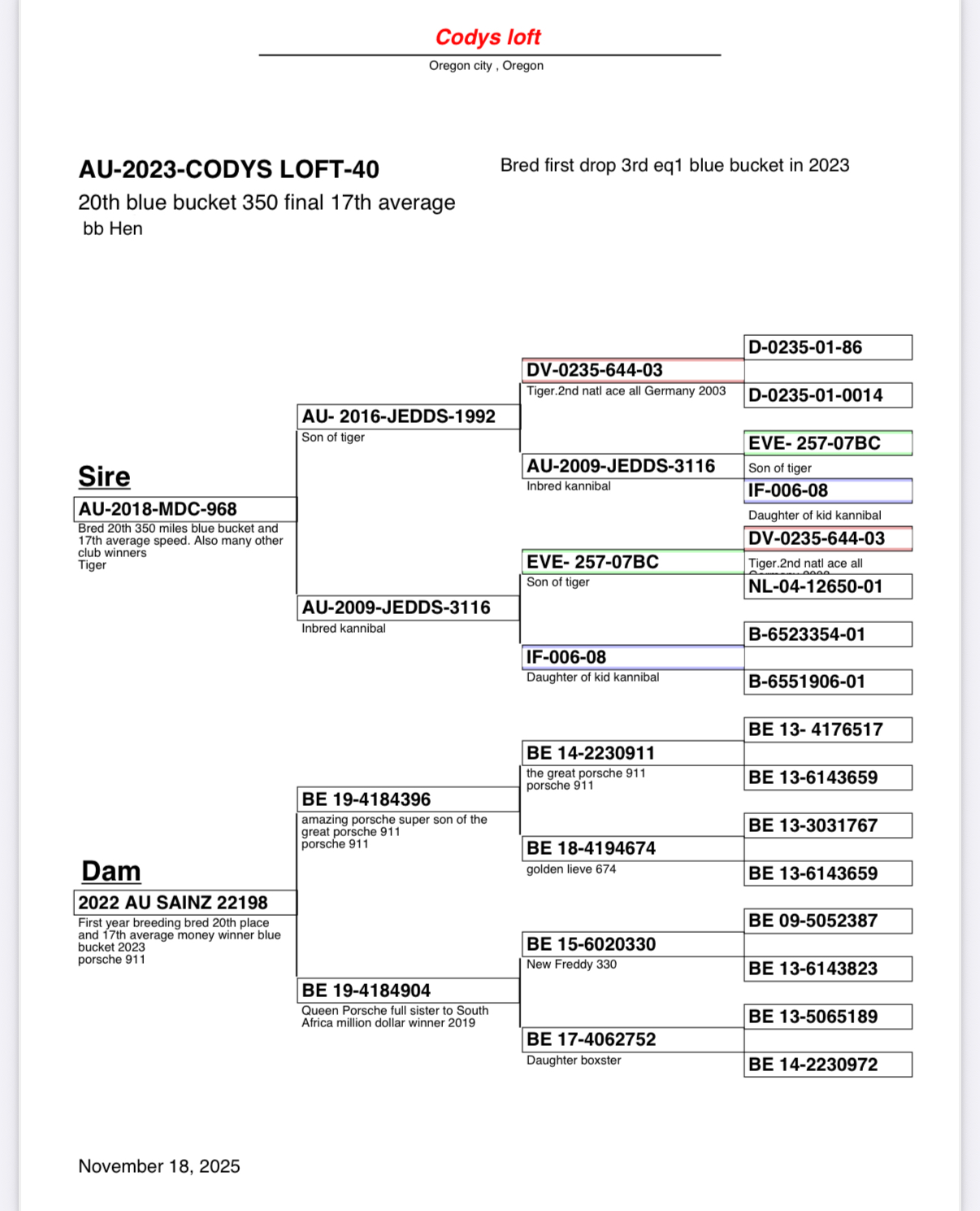 Very nice hen she flew blue bucket came very consistant. 20th place blue bucket final and 17th average. She also bred her first year first drop blue bucket 3rd eq 1st.