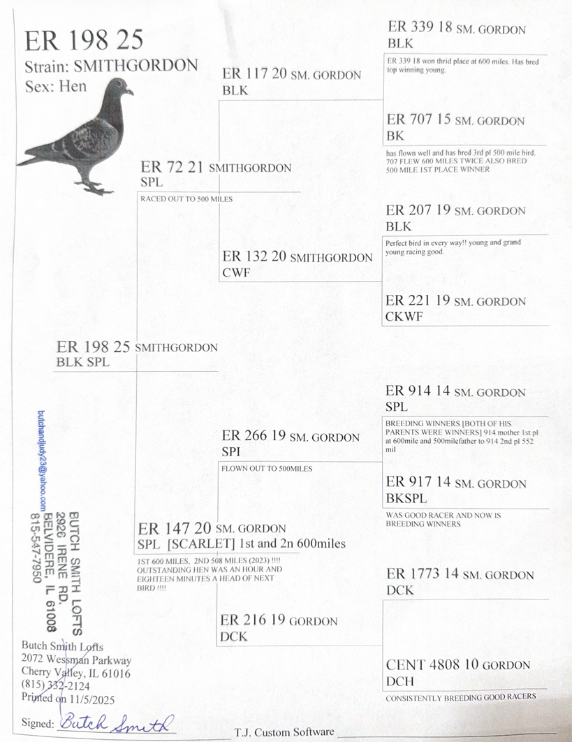 Butch Smith doesn't need and introduction if you are a long-distance flyer.  600 Mile Bloodlines.  Gordons have a long history of success flying all day.  Add some long-distance blood or mix with your OLR birds to increase their toughness.