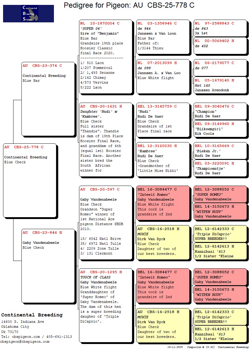 Dam: Double granddaughter of "Inteelt Romeo" super breeding son of "Super Romeo" of Gaby Vandenabeele.